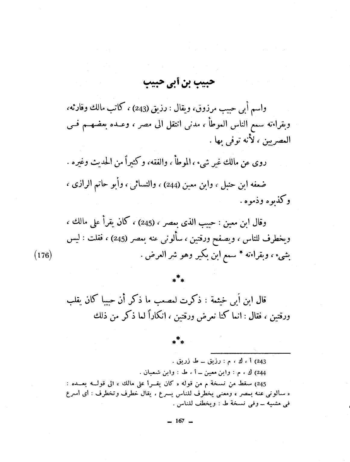 واسم أبي حبيب مرزوق ويقال رزين. كاتب مالك وقارئه، وبقراءته سمع الناس الموطأ. مدني انتقل إلى مصر، وعدة بعضهم في المصريين لأنه توفي بها. روى عن مالك غير شيء، الموطأ والفقه وكثيراً من الحديث وغيره. ضعفه ابن حنبل وابن معين والنسائي وأبو حاتم الرازي وكذبوه وذموه. وقال ابن معين: حبيب الذي بمصر كان يقرأ على مالك ويخطرف للناس ويصفح ورقتين. سألوني عنه فقلت: ليس بشيء. وبقراءته سمع ابن بكير. وهو شر العرض. قال ابن أبي خثيمة ذكرت لمصعب ما ذكر أن حبيباً.