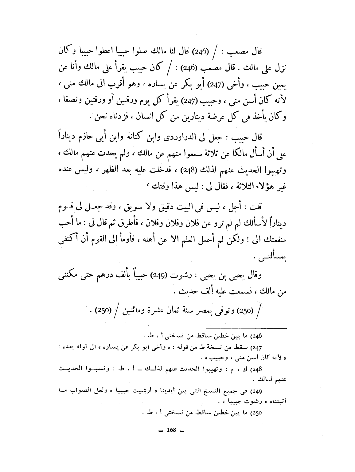 وكان نزل على مالك. قال مصعب قال لنا مالك: صلوا حبيباً. أعطوا حبيباً. وكان نزل على مالك. قال مصعب: كان حبيب يقرأ على مالك وأنا عن يمين حبيب، يقرأ كل يوم ورقتين أو ورقتين ونصفاً. وكان يأخذ في كل عرضة دينارين من كل إنسان، فزدناه نحن. قال حبيب: جعل لي الدراوردي وابن كنانة وابن أبي حاتم ديناراً على أن اسأل مالكاً عن ثلاثة سمعوا منهم مع مالك، ولم يحدث عنهم مالك، وتهيبوا الحديث عنهم لذلك، فدخلت عليه بعد الظهر وليس عنده غير هؤلاء الثلاثة. فقال ليس هذا وقتك. قلت: أجل: ليس في البيت دقيق ولا سويق وقد جعل لي قوم ديناراً لأسألك: لم لم ترو عن فلان وفلان وفلان. فأطرق ثم قال ما أحب منفعتك إلي، ولكن، لم أحمل العلم إلا عن أهله. فأومأ إلى القوم إن أكتفي بمسألتي. وقال يحيى بن يحيى: أرشيت حبيباً بألف درهم حتى مكنني من مالك، فسمعت عليه ألف حديث. وتوفي بمصر سنة ثمان عشرة ومائتين.