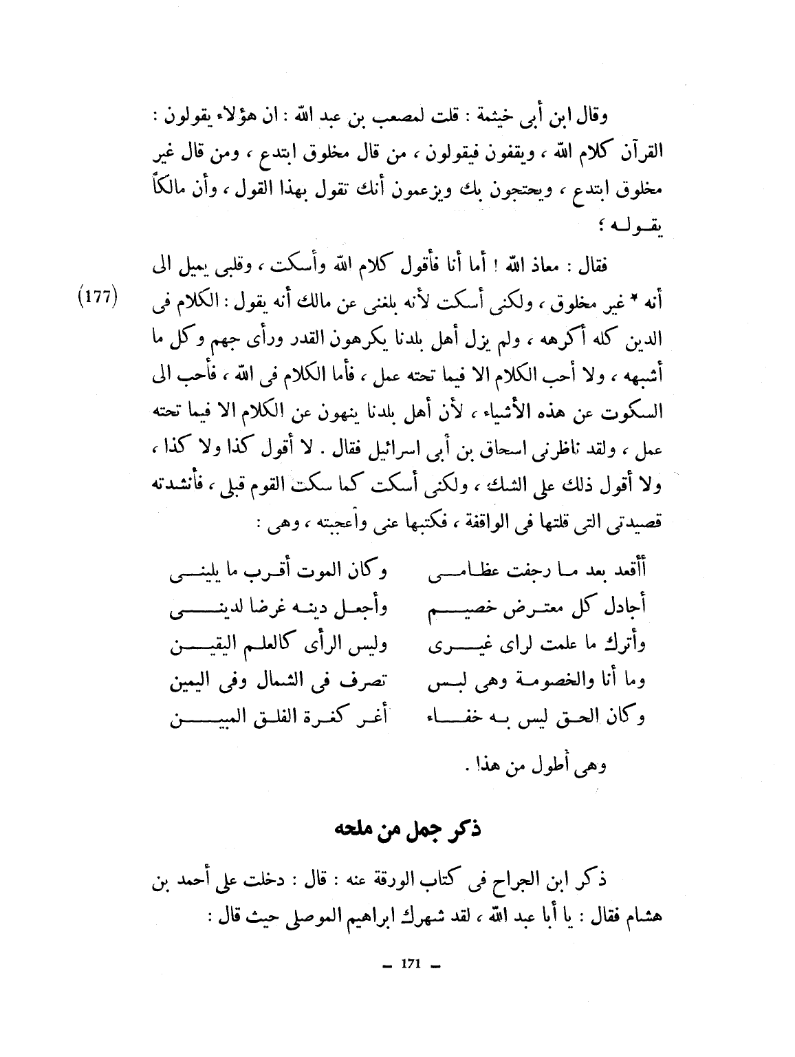 قال ابن أبي خثيمة: قلت لمصعب ابن عبد الله: إن هؤلاء يقولون القرآن كلام الله، ويقفون. فيقولون من قال مخلوق ابتدع، ومن قال غير مخلوق ابتدع ويحتجون بك ويزعمون أنك تقول بهذا القول، وإن مالكاً يقوله. فقال معاذ الله. أما أنا فأقول كلام الله وأسكت وقلبي يميل إلى أنه غير مخلوق، ولكني أسكت لأنه بلغني عن مالك أنه يقول الكلام في الدين كله أكرهه، ولم يزل أهل بلدنا يكرهونه، القدر ورأي جهم، وكلما أشبهه. ولا أحب الكلام إلا فيما تحته عمل، فأما الكلام في الله فأحب إلي السكوت عن هذه الأشياء لأن أهل بلدنا ينهون عن الكلام لا فيما تحته عمل. ولقد ناظرني إسحاق بن إسرائيل فقال: لا أقول كذا ولا كذا ولا أقول ذلك على الشك، ولكني أسكت كما سكت القوم قبلي. فأنشدته قصيدتي التي قلتها في الواقعة فكتبها وأعجبته وهي: