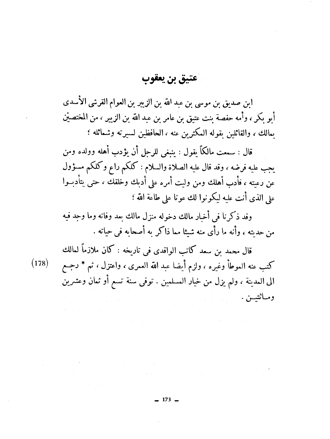 ابن صديق بن موسى بن عبد الله بن الزبير بن العوام القرشي الأسدي أبو بكر. وأمه حفصة ابنة عتيق بن عامر بن عبد الله بن الزبير من المختصين بمالك والقائلين بقوله، المكثرين عنه المحافظين لسيرته وشمائله. قال: سمعت مالكاً يقول: ينبغي للرجل أن يؤدب أهله وولده، ومن يجب عيه فرضه، وقد قال عليه الصلاة والسلام: كلكم راع وكلكم مسؤول عن رعيته. فأدب أهلك أو من وليت أمره على أدبك وخلقك حتى يتأدبوا على الذي أنت عليه ليكونوا لك عوناً على طاعة الله. وذد ذكرنا في أخبار مالك دخوله منزل مالك بعد وفاته، ما وجد فيه من حديثه، وإنه ما رأى منه شيئاً مما ذاكر به أصحابه في حياته. قال محمد بن سعيد كاتب الواقدي في تاريخه: كان ملازماً مالك. كتب عنه الموطأ ويره، ولزم أيضاً عبد الله العمري واعتزل، ثم رجع إلى المدينة، ولم يزل من خيار المسلمين. توفي سنة سبع أو ثمان وعشرين ومائتين