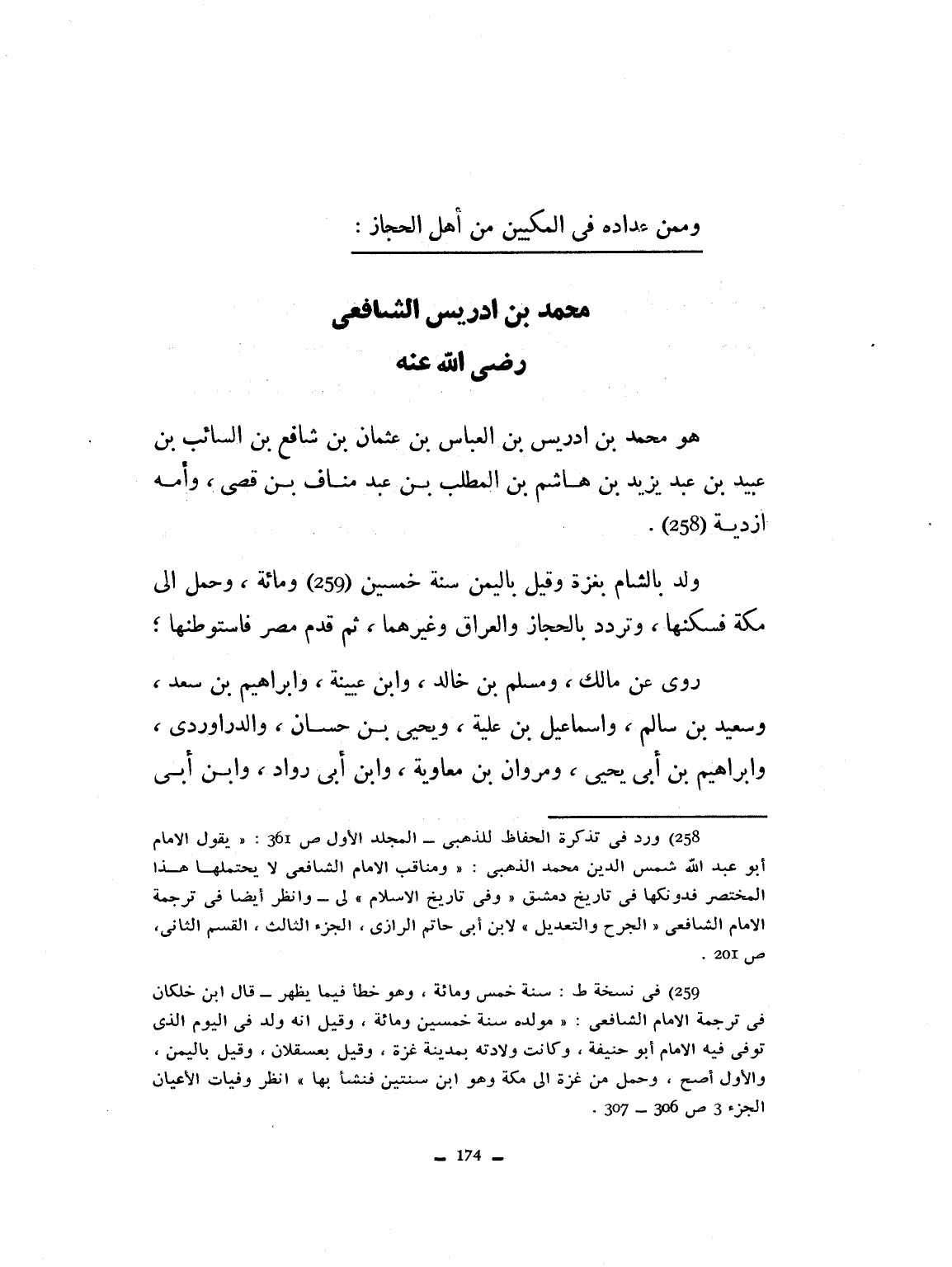 هو محمد بن إدريس بن العباس بن عثمان بن شافع بن السائب بن عبيد ابن عبد يزيد بن هاشم بن المطلب بن عبد مناف بن قصي، وأمه أزدية. ولد بالشام بغزة. وقيل باليمن سنة خمسين ومائة وحمل إلى مكة وسكنها وتردد بالحجاز والعراق وغيرها. ثم قدم مصر واستوطنها. روى عن مالك ومسلم بن خالد وابن عيينة، وإبراهيم بن سعد وسعيد بن سالم وإسماعيل بن علية، ويحيى بن حسان والدراوردي وإبراهيم بن أبي يحيى ومروان بن ماوية