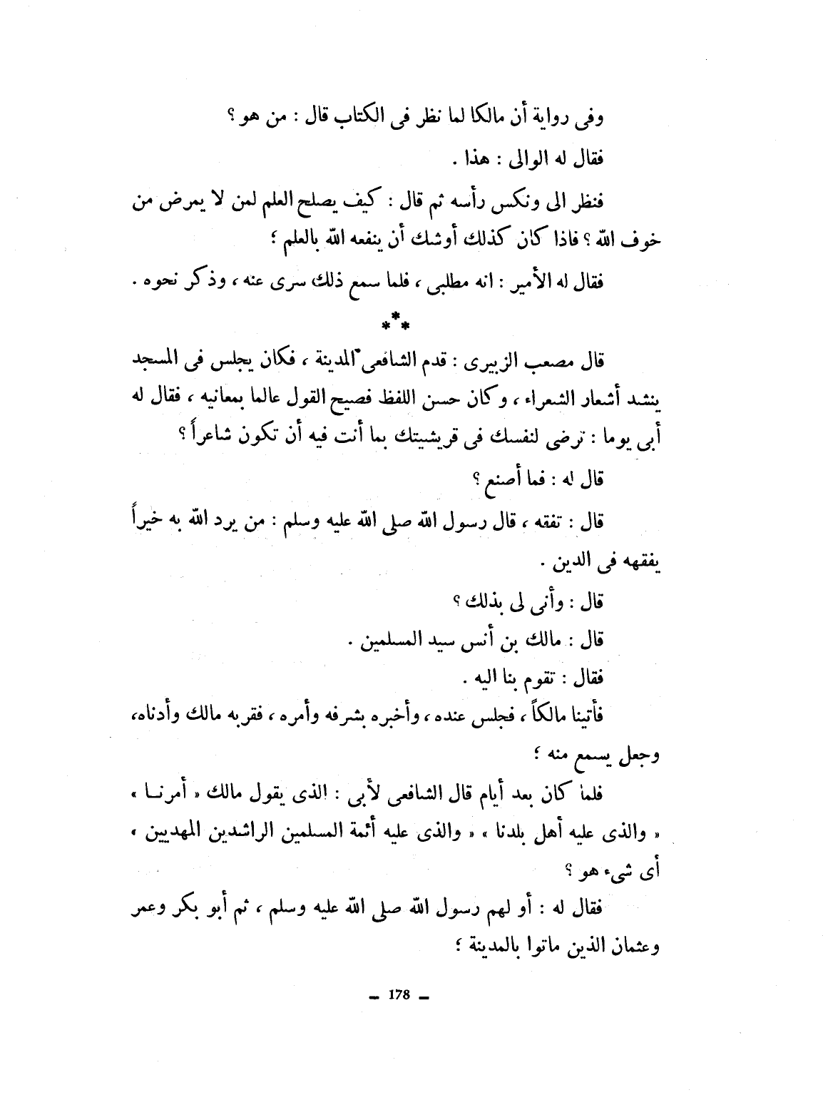 وفي رواية: أن مالكاً لم نظر في الكتاب قال: من هو؟ فقال له الوالي هذا. فنظر إلي ونكس رأسه، ثم قال: كيف يصلح لمن لا يرضى من خوف الله، فإذا كان كذلك أوشك أن ينفعه الله بالعلم. فقال له الأمير هذا مطلبي. فما سمع ذلك سري عنه وذكر نحوه. قال مصعب الزبيري: قدم الشافعي المدينة فكان يجلس في المسجد ينشد أشعار الشعراء، وكان حسن اللفظ فصيح القول، عالماً بمعانيه. فقال له أبي يوماً ترضى لنفسك في قرشيتك مما أنت فيه، أن تكون شاعراً؟ قال فما أصنع؟ قال تفقه. قال رسول الله صلى الله عليه وسلم من يرد الله بن خيراً يفقهه في الدين. قال فأنّى لي بذلك؟ قال: مالك بن أنس سيد المسلمين. قال تقوم بنا إليه. فأتينا مالكاً وجلس عنده وأخبره بشرفه وأمره، فقرّبه مالك وجعل يسمع منه، فلما كان بعد أيام قال الشافعي لأبي: الذي يقول مالك أمرنا، والذي عليه بلدنا، والذي عليه أئمة المسلمين الراشدين المهديين، أي شيء هو؟ فقال له أولهم رسول الله صلى الله عليه وسلم، ثم أبو بكر وعمر وعثمان الذين ماتوا بالمدينة.