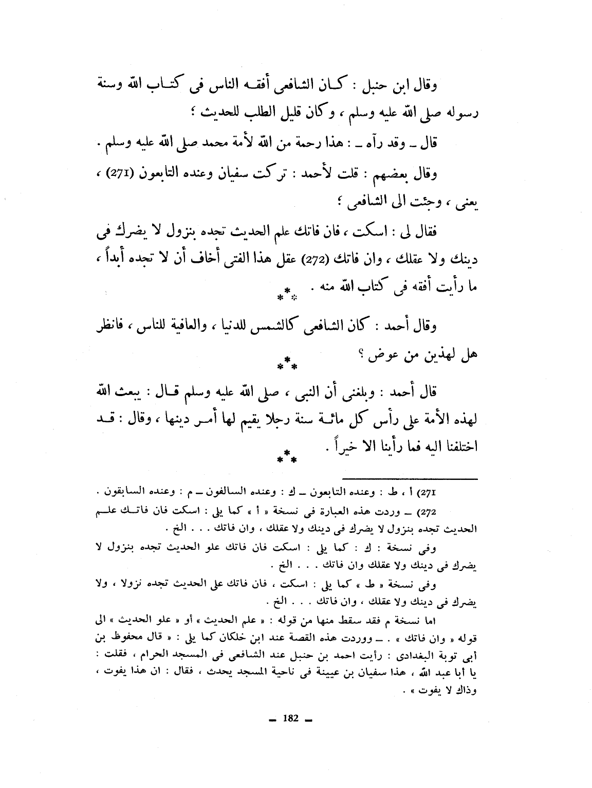 قال ابن حنبل: كان الشافعي أفقه الناس في كتاب الله وسنة رسوله صلى الله عليه وسلم. وكان قليل الطلب للحديث. قال: وقد رآه هذا رحمة من الله لأمة محمد صلى الله عليه وسلم. قال بعضهم قلت لأحمد: تركت سفيان وعنده السالفون - يعني وجنئت إلى الشافعي - فقال لي: اسكت فإن فاتك علو الحديث تجده بنزول لا يضرك في دينك ولا عقلك، وإن فاتك عقل هذا الفتى أخاف أن لا تجده أبداً، ما رأيت أفقه في كتاب الله منه. وقال أحمد: كان الشافعي كالشمس للدنيا والعافية للناس. فانظر هل لهذين من عوض. قال أحمد: وبلغني أن النبي صلى الله عليه وسلم قال: يبعث الله لهذه الأمة على رأس كل مائة سنة رجلاً يقيم لها أمر دينها وقال: قد اختلفنا إليه فما رأينا إلا خيراً.
