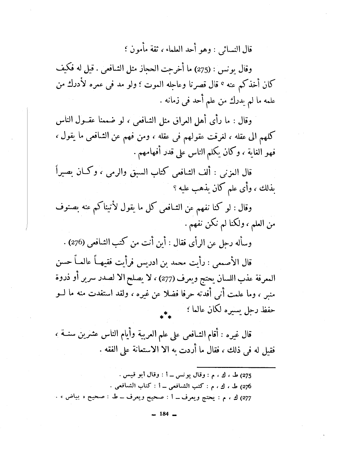 ومن فهم عن الشافعي ما يقول فهو الغاية. وكان يكلم الناس على قدر إفهامهم. قال المزني: ألف الشافعي كتاب السبق والرمي وكان بصيراً بذلك. وأي علم كان يذهب عليه. وقال: لو كنا نفهم عن الشافعي كل ما يقول، لأتيناكم عنه بصنوف من العلم. ولكنا لم نكن نفهم. وسأله رجل عن الرأي فقال: أين أنت من كتب الشافعي. قال الأصمعي: ورأيت محمد بن إدريس، فرأيت فقيهاً عالماً حسن المعرفة عذب اللسان، يحتج ويعرف، ولا يحسن إلا لصدر سرير، وذروة منبر، وما علمت أني أفدت حرفاً، فضلاً عن غيره. ولقد استفدت من ما لو حفظ رجل يسيره هكذا لكان عالماً. قال غيره: أقام الشافعي في علم العربية وأيام الناس عشرين سنة. فقيل له في ذلك. فقال ما أردت به إلا الاستعانة على الفقه.