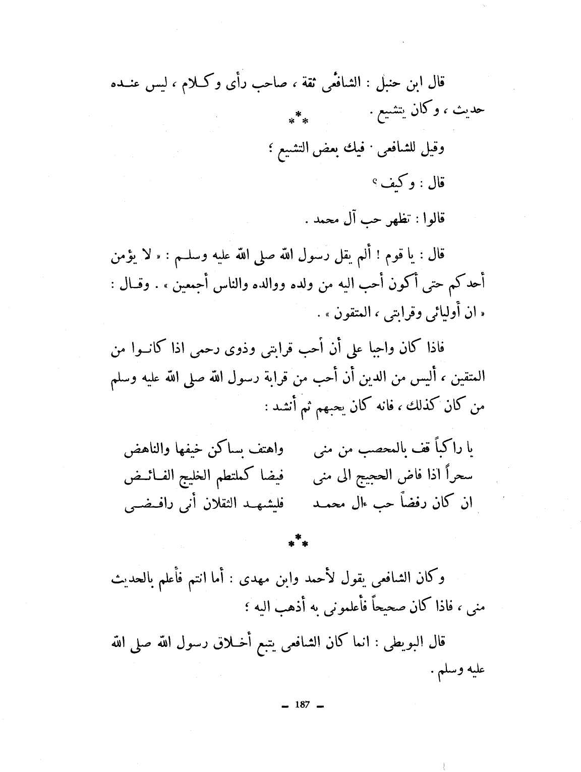 قال ابن حنبل: الشافعي ثقة صاحب رأية وكلام، وليس عنده حديث. وكان يتشيع. وقيل للشافعي فيك بعض التشيع. قال: وكيف؟ قالوا: تظهر حب آل محمد. قال: يا قوم، ألم يقل رسول الله صلى الله عليه وسلم لا يؤمن أحدكم حتى أكون أحب إليه من والده وولده والناس أجمعين؟ وقال إن أوليائي وقرابتي المتقون، فإذا كان واجباً أن أحب قرابتي وذوي رحمي إذا كانوا من المتقين، أليس من الدين أن أحب من قرابة رسول الله صلى الله عليه وسلم من كان كذلك؟ فإنه كان يحبهم. ثم أنشد: