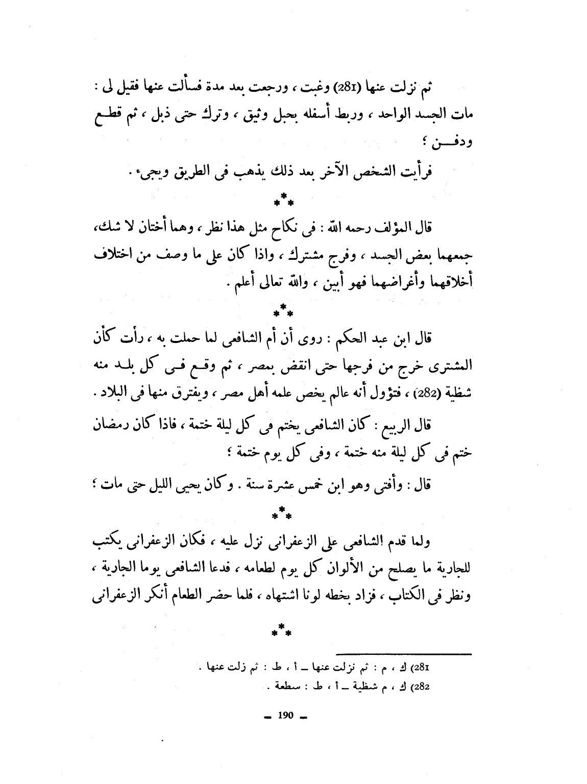 ثم نزلت عنها وغبت ورجعت بعد مدة، فسألت عنها، فقيل: مات الجسد الواحد وربط أسفله بحبل وثيق، وترك حتى ذبل ثم قطع ودفن، فرأيت الشخص الآخر بعد ذلك يذهب في الطريق ويجيء. قال المؤلف رحمه الله في نكاح مثل هذا نظر! وهما أختان لا شك جمعهما بعض الجسد وفرج واحد مشترك، وإذا كان على ما وصف من خلاف أخلاقهما وأغراضهما فهو أبين والله تعالى أعلم. قال ابن عبد الحكم: روى أن أم الشافعي لما حملت به، رأت كأن المشتري خرج من فرجها، حتى انقض بمصر ثم وقع في كل بلد منه شظية.