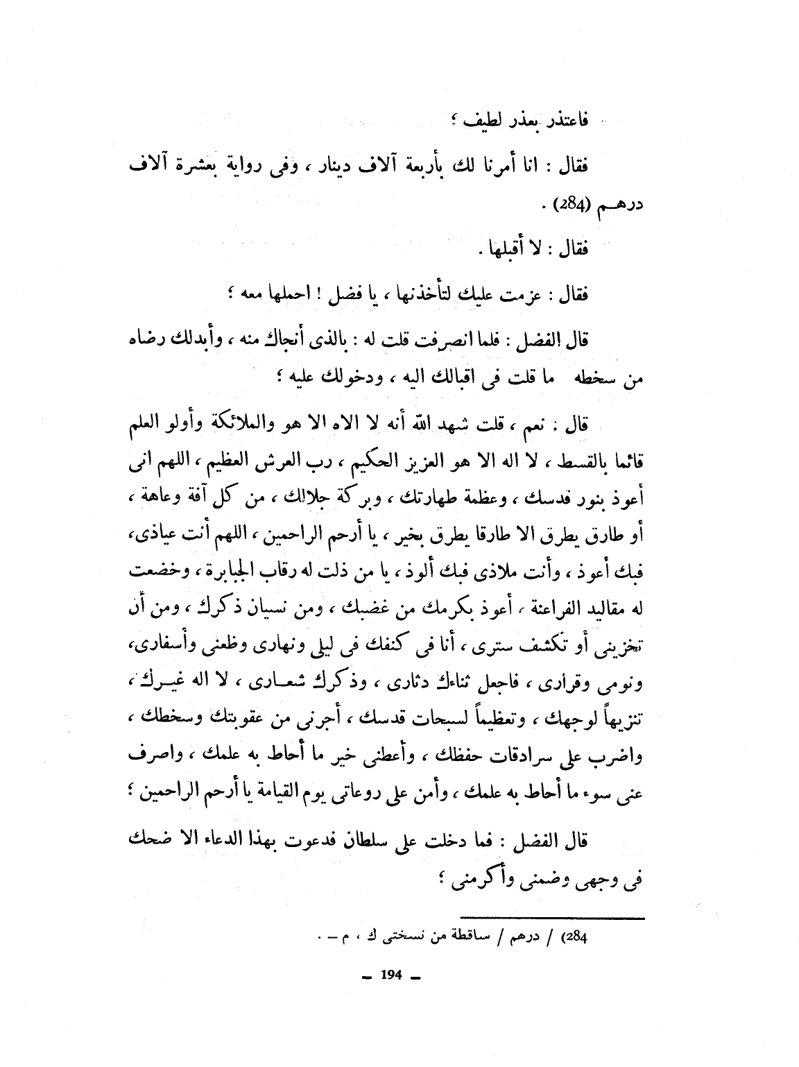 فاعتذر بعذر لطيف. فقال إن أمرنا لك بأربعة آلاف دينار وفي رواية بعشرة آلاف. فقال لا أقبلها. فقال: عزمت عليك لتأخذها. يا فضل، احملها معه. قال الفضل: فلما انصرف قلت: بالذي أنجاك منه وأبدل لك رضاه من سخطه، ما قلت في إقبالك إليه ودخولك عليه. قال نعم. قلت: شهد الله أنه لا إله إلا هو العزيز الحكيم رب العرش العظيم. اللهم إني أعوذ بنور قدسك، وعظمة طهارتك، وبركة جلالك، من كل آفة أو عاهة أو طارق، إلا طارقاً يطرق بخير يا أرحم الراحمين. اللهم أنت عياذي، فبك أعوذ وأنت ملاذي فبك ألوذ، يا من ذلت له رقاب الجبابرة، وخضعت له مقاليد الفراعنة، أعوذ بكرمك من غضبك ومن نسيان ذكرك، ومن أن تخزني أو تكشف ستري، أنا في كنفك في ليلي ونهاري، وظعني وأسفاري ونومي وقراري.