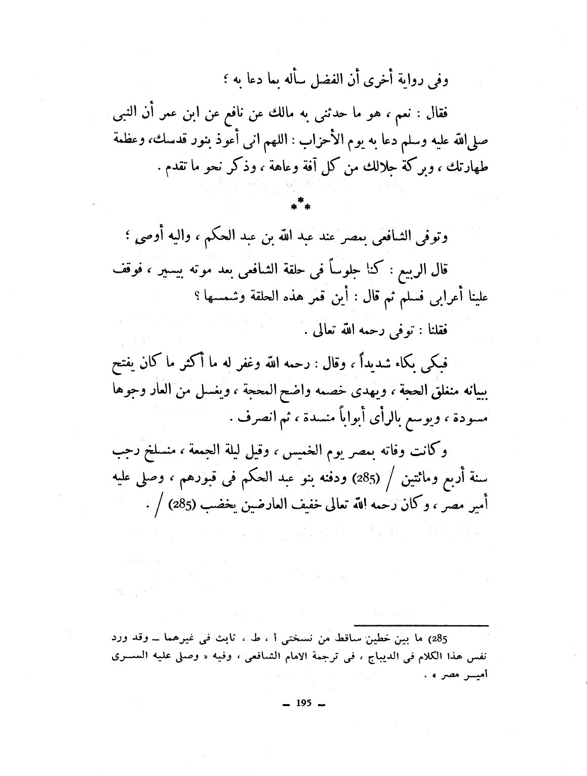 وفي رواية أخرى، إن الفضل سأله بما دعى به، فقال له نعم. هو ما حدثني به مالك عن نافع عن ابن عمر أن النبي صلى الله عليه وسلم، دعا به يوم الأحزاب: اللهم إني أعوذ بنور قدسك وعظمة طهارتك وبركة جلالك من كل آفة وعاهة. وذكر نحو ما تقدم. وتوفي الشافعي بمصر عند عبد الله بن عبد الحكم وإليه أوصى. قال الربيع: كنا جلوساً في حلقة الشافعي بعد موته بيسير، فوقف علينا إعرابي فسلم، ثم قال أين قمر هذه الحلقة وشمسها؟ فقلنا توفي رحمه الله تعالى، فبكى بكاءاً شديداً وقال رحمه الله وغفر له، ما كان يفتح ببيانه منغلق الحجة ويهدي خصمه واضح الحجة، ويغسل من العار وجوهاً مسودة، ويوسع من الرأي أبواباً منسدة، ثم انصرف. وكانت وفاته بمصر يوم لخميس وقيل ليلة الجمعة منسلخ رجب سن أربع ومائتين ودفنه بنو الحكم في قبورهم. وصلى عليه أمير مصر وكان رحمه الله تعالى خفيف العارضين يخضب.