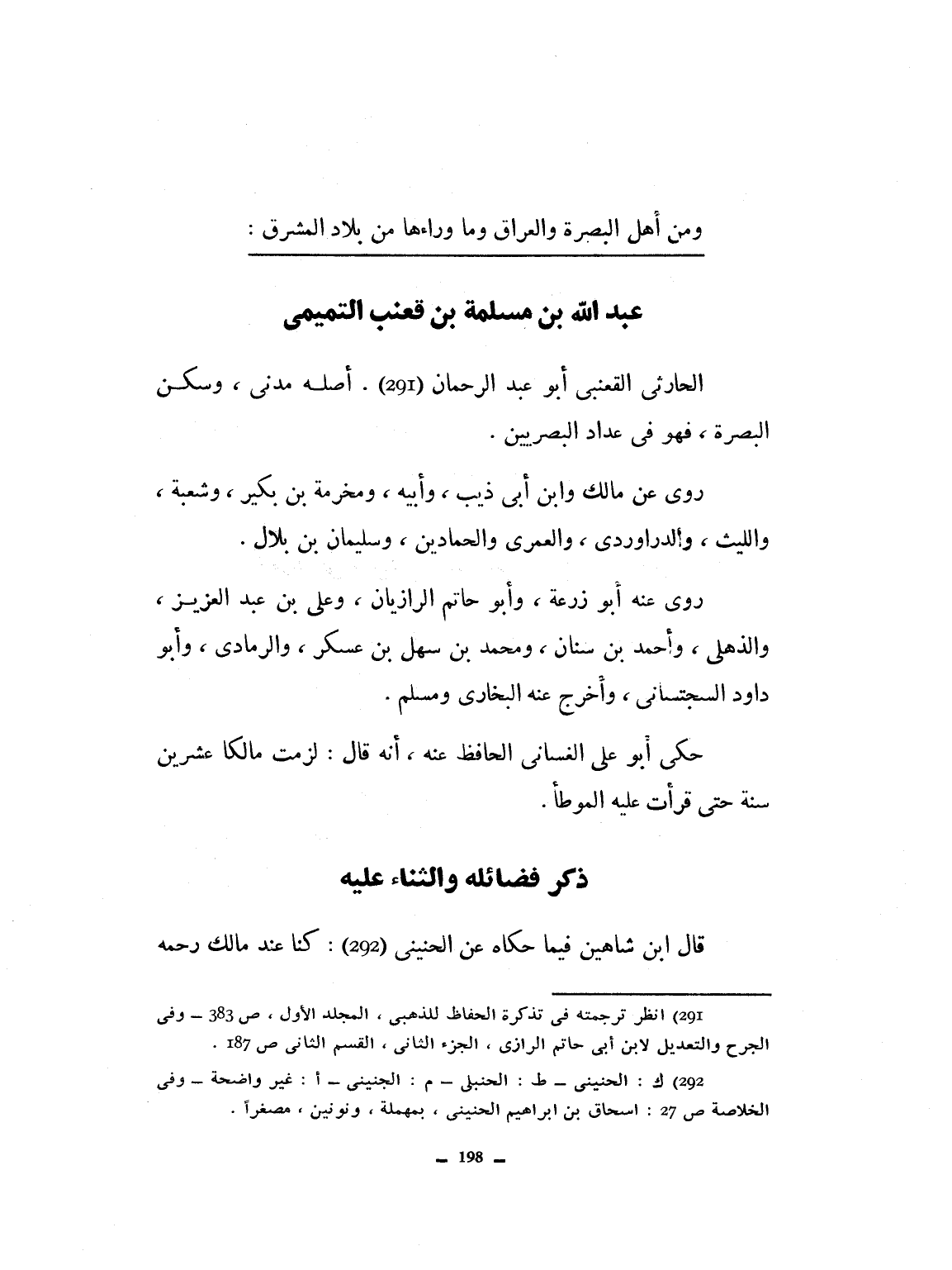 ابن قعنب التميمي الحارثي، القعنبي أبو عبد الرحمن، اصله مدني وسكن البصرة، فهو من عداد البصريين. روى عن مالك وابن أبي ذئب وابنه، ومخرمة بن بكير وشعبة والليث والدراوردي والعمري والحمادين وسليمان ابن بلال. روى عنه أبو زرعة، وأبو حاتم الرازيان، وعلي بن عبد العزيز والذهلي وأحمد بن سنان، ومحمد بن سهل بن عسكر، والرمادي، وأبو داود السجستاني، وأخرج عنه البخاري ومسلم. حكى أبو علي الغساني الحافظ عنه أنه قال: لزمت مالكاً عشرين سنة حتى قرأت عليه الموطأ.