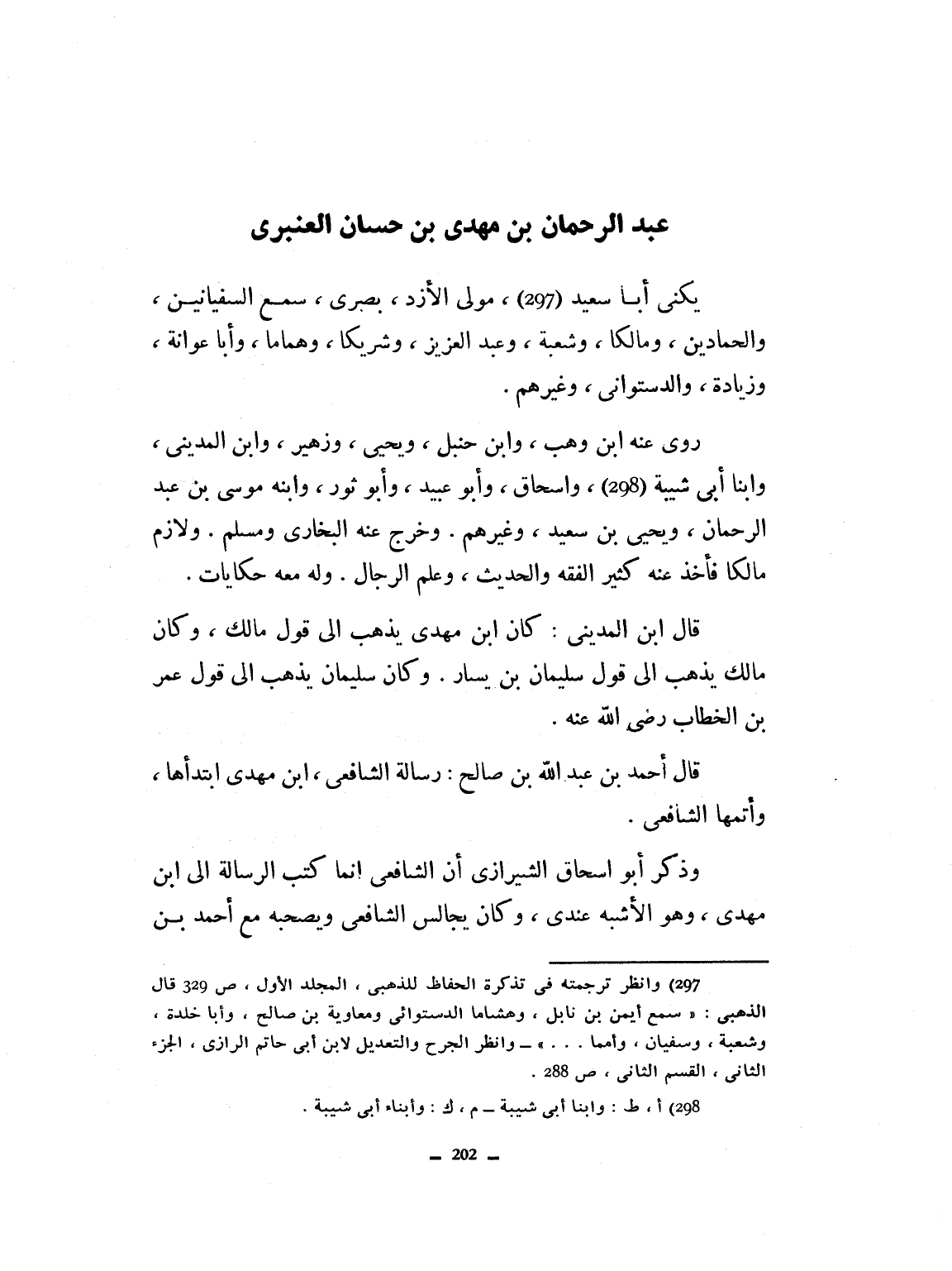 يكنى أبا سعيد، مولى الأزد بصري، سمع السفيانيين والحمادين ومالكاً، وشعبة وعبد العزيز وشريكاً وهماماً، وأبا عوانة وزائدة والأسطواني، وغيرهم. روى عنه ابن وهب وابن حنبل ويحيى وزهير وابن المديني، وابنا أبي شيبة وإسحاق، وأبو عبيد وأبو ثور وابنه موسى بن عبد الرحمان وإسحاق ابن سعيد وغيرهم. وخرج عنه البخاري ومسلم، ولازم مالكاً فأخذ عنه كثير الفقه والحديث وعلم الرجال، وله معه حكايات. قال ابن المديني: كان ابن مهدي يذهب إلى قول سفيان بن يسار، وكان سليمان يذهب إلى قول عمر بن الخطاب رضي الله تعالى عنه. قال أحمد بن عبد الله بن صالح: رسالة الشافعي ابن مهدي ابتدأها، وأتمها الشافعي. وذكر أبو إسحاق الشيرازي: إن الشافعي إنما كتب الرسالة إلى ابن مهدي، وهو الأشبه عندي. وكان يجالس الشافعي ويصحبه مع أحمد بن