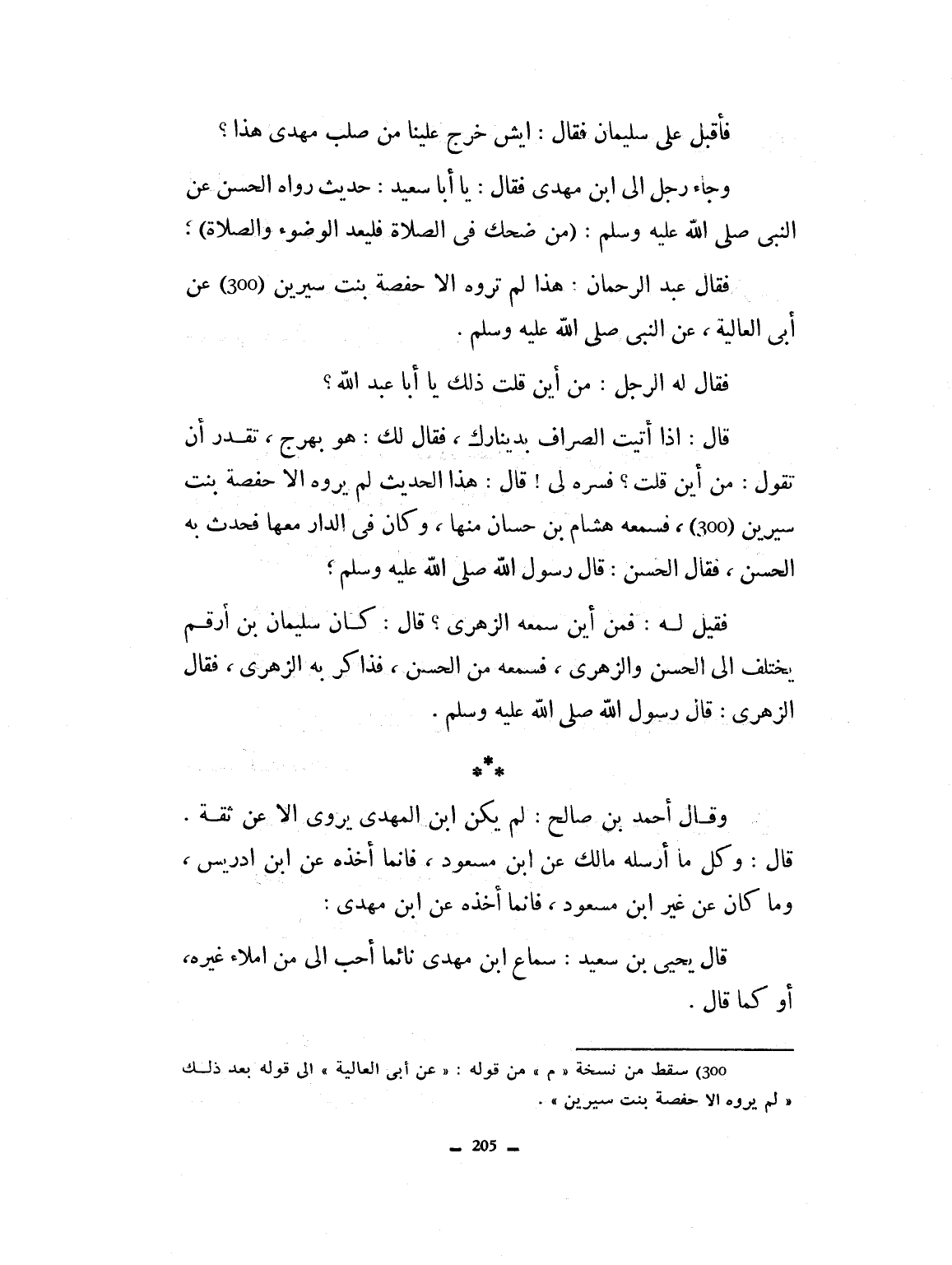 فأقبل علي سليمان فقال: إيش خرج علينا من صلب مهدي هذا. وجاء رجل إلى ابن مهدي فقال: يا أبا سعيد حديث رواه الحسن عن النبي صلى الله عليه وسلم، من ضحك في الصلاة فليعد الوضوء والصلاة. فقال عبد الرحمان هذا لم تروه إلا حفصة بنت سيرين عن أبي العالية، عن النبي صلى الله عليه وسلم فقال له الرجل: من أين قلت ذلك يا أبا عبد الله؟ فقال إذا أتيت الصراف بدينارك فقال لك: هذا سرح. تقدر أن تقول له من اين قلت؟ فقال: فسره لي. قال هذا الحديث لم تروه إلا حفصة بنت سيرين. فسمعه هشام بن حسان منها وكان في الدار معها. فتحدث به الحسن: قال رسول الله صلى الله عليه وسلم. فقيل له من أين سمعه الزهري؟ قال كان سليمان بن أرقم يختلف إلى الحسن والزهري، فسمعه من الحسن، فذاكر به الزهري فقال الزهري قال رسول الله صلى الله عليه وسلم. قال لي أحمد بن صالح، لم يكن ابن مهدي يرويه إلا عن ثقة. وكل ما أرسله مالك عن ابن مسعود فإنما أخذه عن ابن إدريس، وما كان عن غير ابن مسعود، فإنما أخذه عن ابن إدريس، وما كان عن غير ابن مسعود، فإنما أخذه عن ابن مهدي. قال يحيى بن سعيد: سماع ابن مهدي نائماً أحب إلي من إملاء غيره. وكما قال.