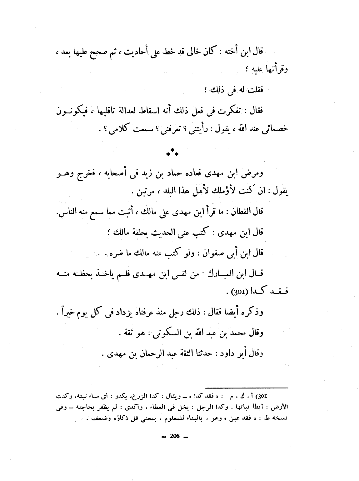 قال ابن أخته كان خالي قد خط علي أحاديث، ثم صحح عليها بعد، وقرأتها عليه، فقلت له في ذلك، فقال: تفكرت في فصل ذلك لعله إسقاط لعدالة قبلها، فيكونون خصماء لي عند الله. يقول رأيتني؟ تعرفني؟ سمعت كلامي؟ ومرض ابن مهدي لأهل هذا البلد مرتين. وقال القطان: ما قرأ ابن مهدي على مالك أثبت مما سمع عنه الناس قال ابن مهدي: كتب عني الحديث بحلقة مالك. قال ابن أبي صفوان لو كتب عنه مالك ما ضره. قال ابن المبارك: من لقي ابن مهدي فلم يأخذ بخطه منه، فقد (كذا) وذكره أيضاً. فقال: ذلك رجل منذ عرفناه يزداد في كل يوم خيراً. وقال محمد بن عبد الله بن السكوني: هو ثقة. وقال أبو داود فيه: حدثنا الثقة عبد الرحمان بن مهدي.