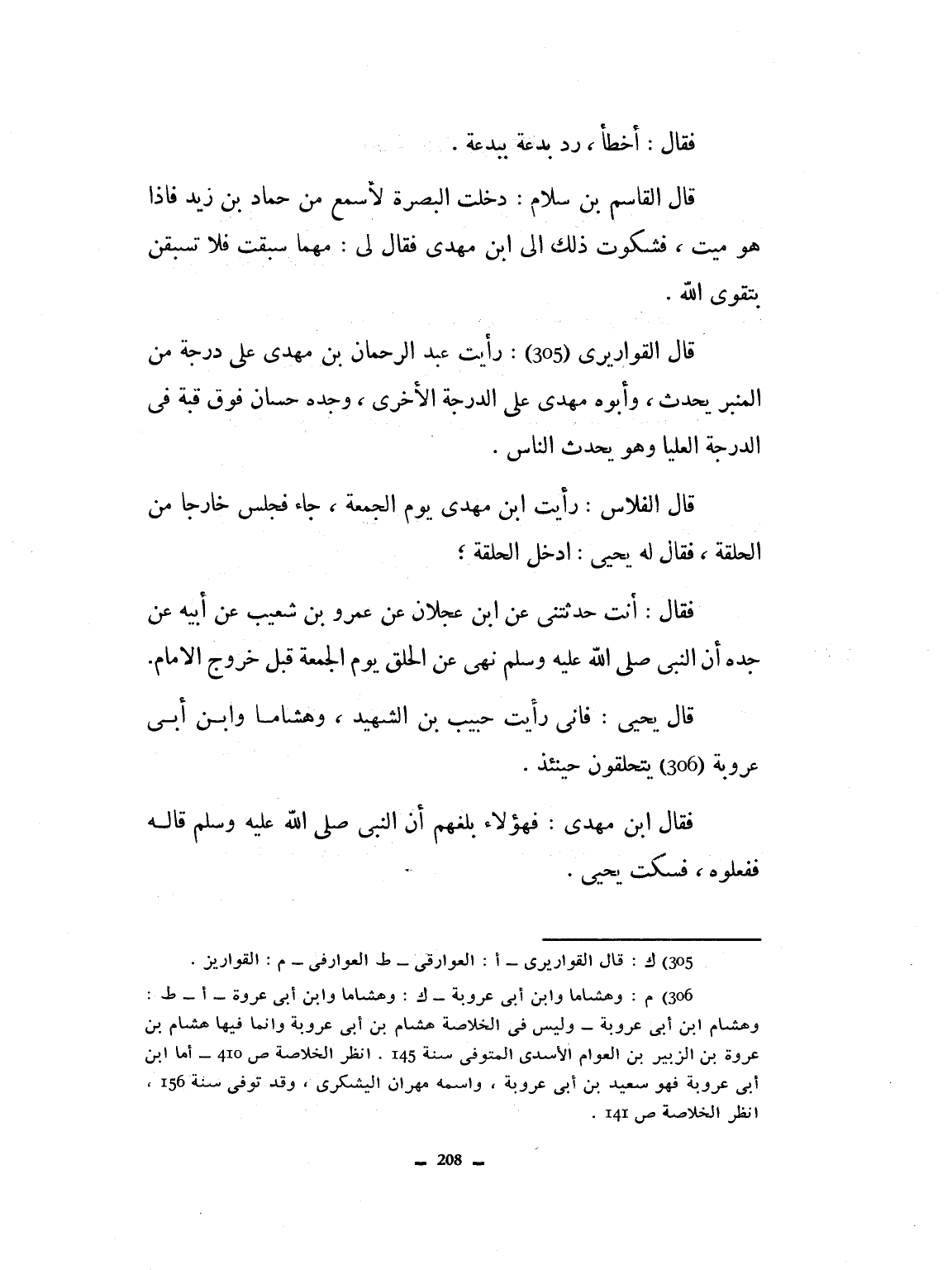 فقال: أخطأ، رد بدعة ببدعة. قال القاسم بن سلام: دخلت البصرة لأسمع من حماد بن زيد فإذا هو ميت فشكوت ذلك إلى ابن مهدي، فقال لي مهما سبقت فلا تسبقن بتقوى الله. قال القواريري: رأيت عبد الرحمان بن مهدي على درجة من المنبر يحدث، وأبوه مهدي على الدرجة الأخرى، وجده حسان من فوق ثبة في الدرجة العليا، وهو يحدث الناس. قال العباس رأيت ابن مهدي جاء يوم الجمعة فجلس خارجاً عن الحلقة فقال له يحيى: ادخل الحلقة. فقال أنت حدثتني عن ابن عجلان عن عمرو بن شعيب عن أبيه عن جده، أن النبي صلى الله عليه وسلم نهى عن الحلق يوم الجمعة قبل خروج الإمام. قال يحيى: فإني رأيت حبيب ابن الشهيد وهشاماً وابن أبي عروبة يتحلقون. قال ابن مهدي: فهؤلاء بلغهم أن النبي صلى الله عليه وسلم قاله ففعلوه. فسكت يحيى.