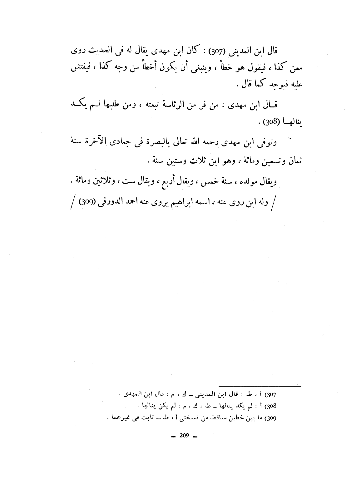 قال ابن المهدي (هكذا) : كان ابن مهدي، يقال له في الحديث روى معن كذا. فيقول هو خطأ وينبغي أن يكون أخطأ عن وجه كذا. فيفتش عليه، فيوجد. كما قال ابن مهدي: من فر من الرئاسة تبعته. ومن طلبها لم يكن ينالها. وتوفي ابن مهدي رحمه الله تعالى بالبصرة في جمادى الأخرى سنة ثمان وتسعين، ويقال أربع ويقال ست وثلاثين ومائة. وله ابن روى عنه، اسمه إبراهيم، يروي عنه أحمد الدوري.