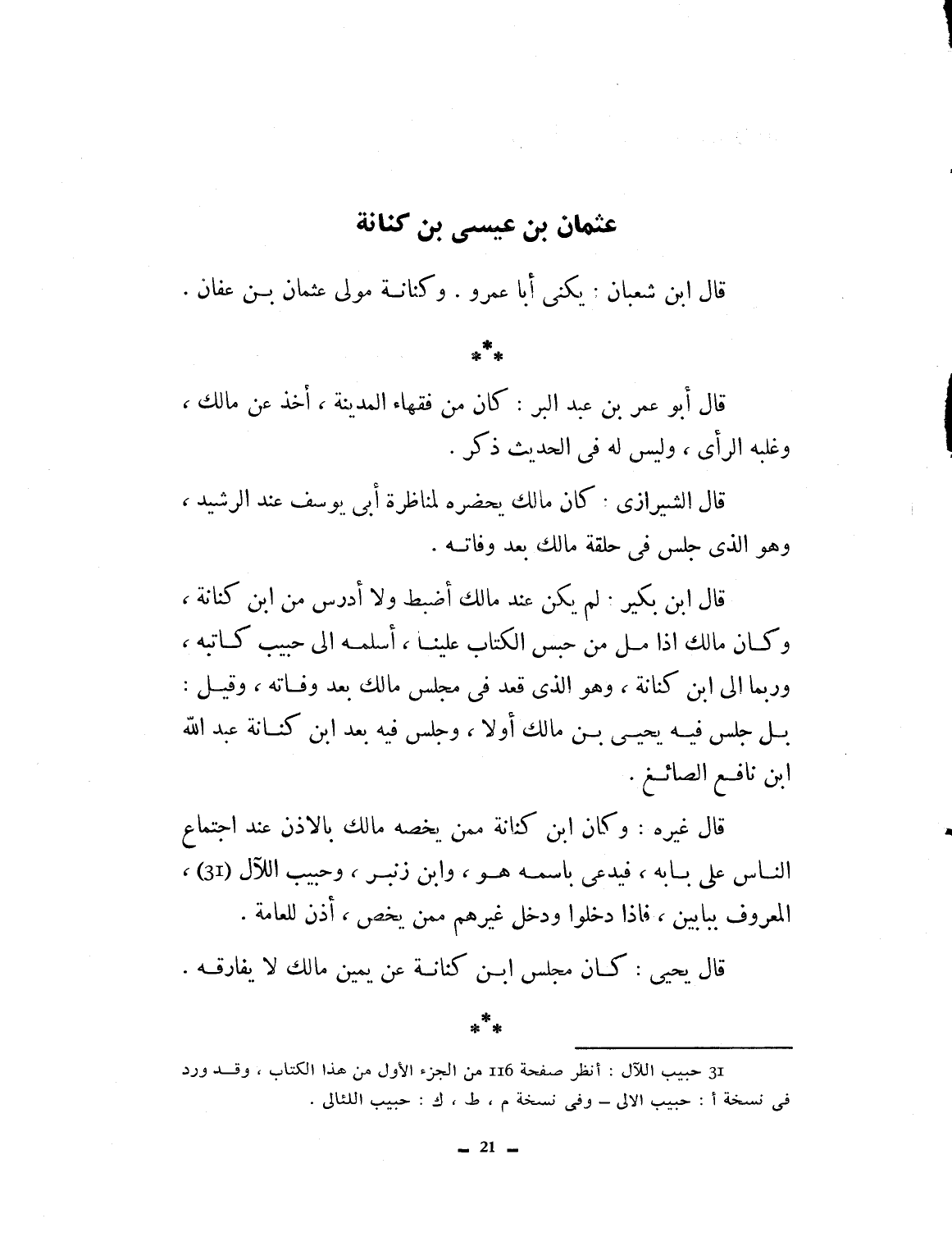 قال ابن سعبان: يكنى أبا عمرو. وكنانة مولى عثمان بن عفان، قال أبو عمر بن عبد البر: كان من فقهاء المدينة، أخذ عن مالك وغلبة الرأي، وليس له في الحديث ذكر. قال الشيرازي كان مالك يحضره لمناظرة أبي يوسف عند الرشيد، وهو الذي جلس في حلقة مالك بعد وفاته. قال ابن بكير لم يكن عند مالك أضبط ولا أدرس من ابن كنانة وكان مالك إذا مل من حبس الكتاب علينا أسلمه إلى حبيب كاتبه، وربما إلى ابن كنانة وهو الذي قعد في مجلس مالك بعد وفاته، وقيل بل جلس فيه يحيى بن مالك أولاً، وجلس فيه بعد ابن كنانة عبد الله بن نافع الصائغ. قال غيره: وكان ابن كنانة ممن يخصه مالك بالأذن عند اجتماع الناس على بابه. فيدعى باسمه هو وابن زنبر وحبيب اللئالي المعروف ببابين. فإذا دخلوا ودخل غيرهم ممن يخصه أذن للعامة. قال يحيى: كان يجلس ابن كنانة عن يمين مالك لا يفارقه.