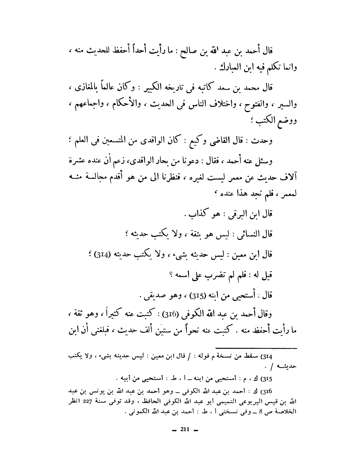 قال أحمد بن عبد الله بن صالح: ما رأيت أحفظ للحديث منه. وإنما تكلم فيه ابن المبارك. قال محمد بن سعد كاتبه في تاريخه الكبير: كان عالماً بالمغازي والسير والفتوح، واختلاف الناس في الحديث والأحكام، وإجماعهم، ووضع الكتب، وحدث. قال القاضي وكيع: كان الواقدي من المتسعين في العلم. وسئل عنه أحمد، فقال: دعونا من بحار الواقدي، زعم أن عنده عشرة آلاف حديث عن معمر ليست لغيره، فنظرنا إلى من هو أقدم منه مجالسة منه لمعمر فلم نجد هذا عنده. قال ابن البرقي هو كذاب. قال النسائي: ليس هو بثقة. ولا يكتب حديثه. قيل له فلم لم تضرب على اسمه؟ قال أستحي من ابنه وهو صديقي. وقال أحمد ابن عبد الله: كتبت نحواً من ستين ألف حديث. فبلغني أن ابنه