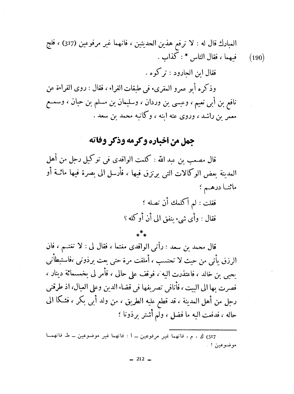 المبارك قال له: لا ترفع هذين الحديثين، فإنهما غير مرفوعين. فلج فيهما. فقال الناس: كذاب. فقال الجارود تركوه. وذكره أبو عمرو المقرىء في طبقات القراء. فقال روى القراءة عن نافع بن أبي تميم وعيسى بن وردان وسليمان ابن مسلم بن حبان، وسمع معمر بن راد هكذا روى عنه ابنه وكاتبه محمد بن سعد.