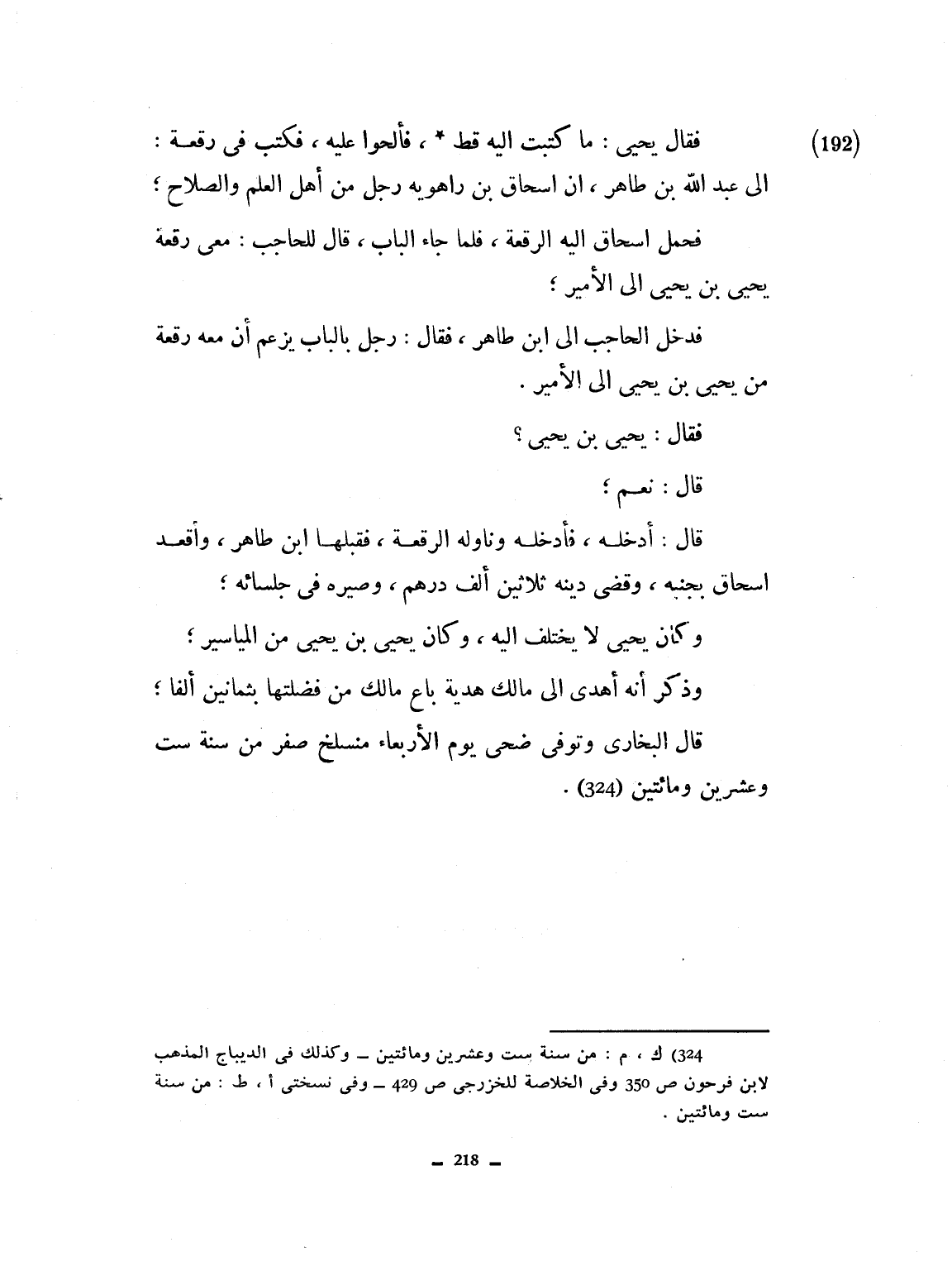 فقال يحيى: ما كتبت إليه، فألحوا عليه، فكتب في رقعة: إلى عبد الله بن طاهر، إسحاق بن إبراهيم رجل من أهل العلم والصلاح. فحمل إسحاق الرقعة إليه فلما جاء الباب فقال للحاجب: معي رقعة يحيى ابن يحيى إلى الأمير. فقال يحيى بن يحيى: قال نعم. قال: أدخله. فأدخله وناوله الرقعة فقبلها ابن طاهر وأقعد إسحاق بجنبه، وقضى دينه ثلاثين ألف درهم، وصيره في جلسائه، وكان لا يختلف إليه، وكان يحيى بن يحيى من المياسير، وذكر أنه أهدى هدية إلى مالك باع مالك من فضلتها بثمانين ألفاً. قال البخاري وتوفي ضحى يوم الأربعاء منسلخ صفر في سنة ست وعشرين ومائتين.