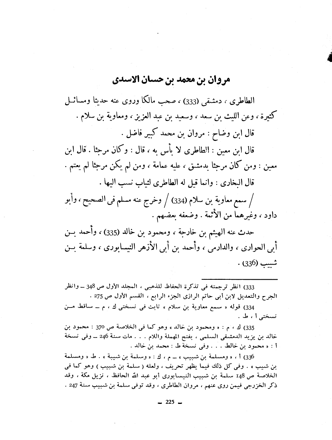الظاهري دمشقي صحب مالكاً وروى عنه حديثاً ومسائل كثيرة وعن الليث بن سعد وسعيد بن عبد العزيز ومعاوية بن سلام. قال ابن وضاح: مروان بن محمد كبير فاضل. قال ابن معين: ومن كان مرجئاً بدمشق عليه عمامة، ومن لم يكن مرجئاً لم يعتم. قال البخاري: وإنما قيل له الظاهري لثياب نسب إليها. سمع معاوية بن سلام وخرّج عنه مسلم في الصحيح وأبو داود وغيرهما من الأئمة وضعفه بعضهم. حدث عنه الهيثم بن خارجة ومحمود بن خالد وأحمد ابن أبي الجواري والرازي وأحمد بن أبي الأزهر النيسابوري، وسلمة بن شيبة.
