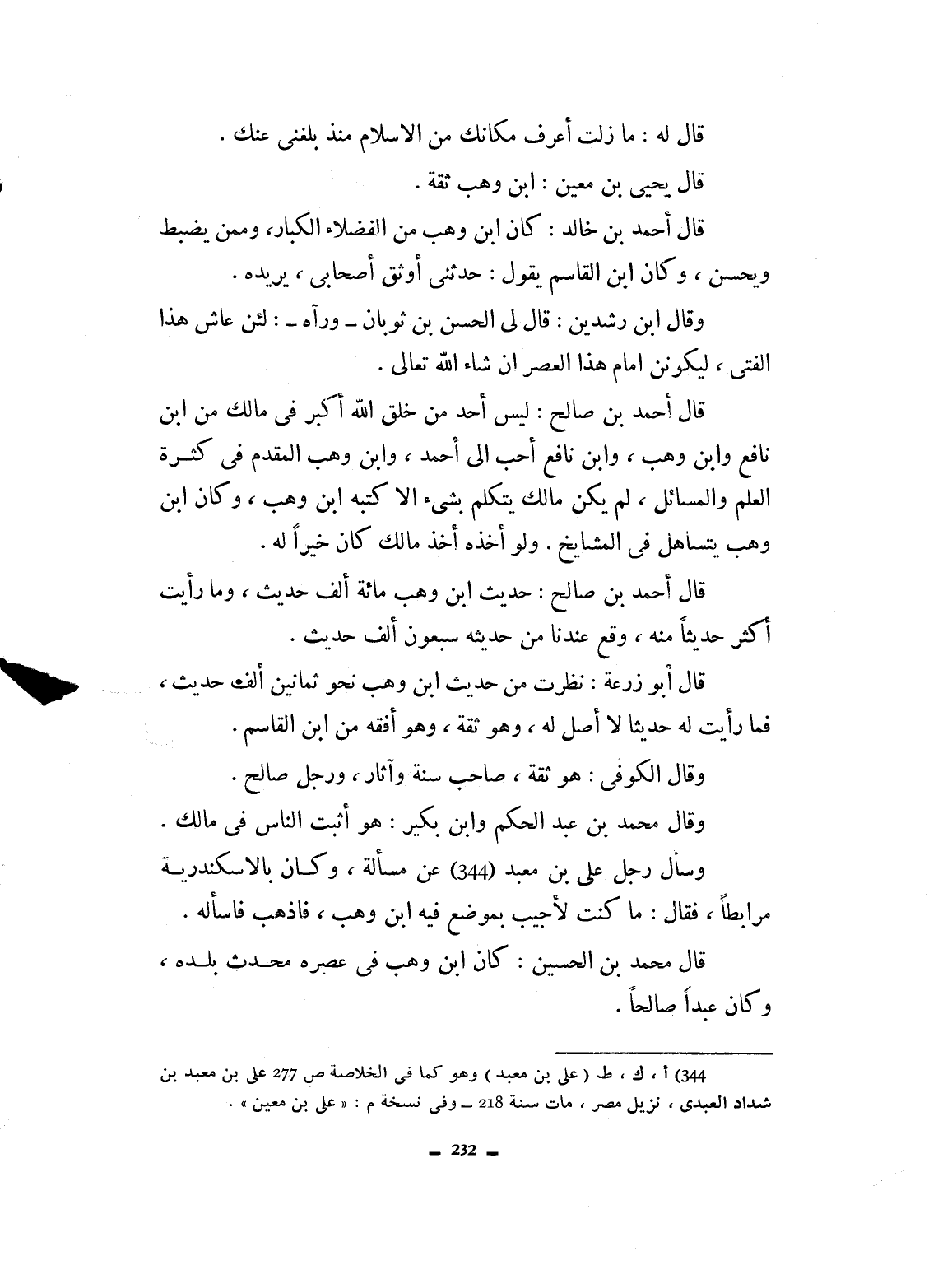 قال له: ما زلت أعرف مكانك من الإسلام منذ بلغني عنك قول يحيى بن معين ابن وهب ثقة.
