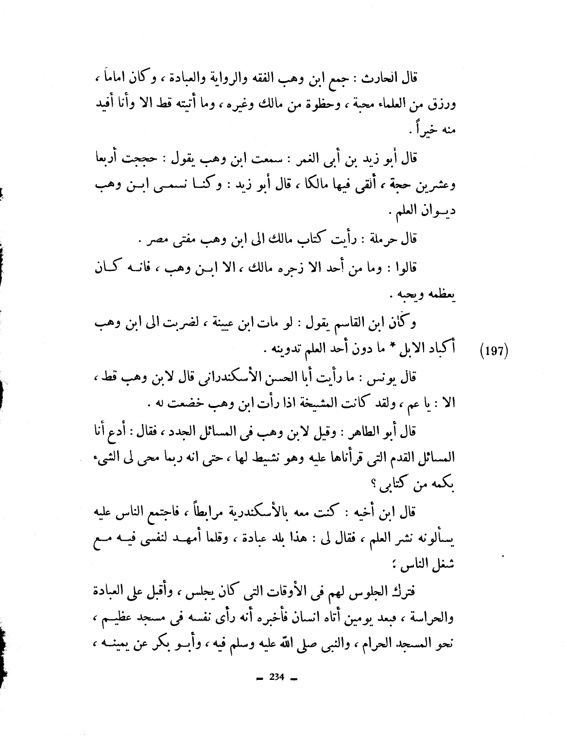 قال الحارث: جمع ابن وهب الفقه والرواية والعبادة، وكان إماماً ورزق من العلماء محبة، وحظوة من مالك وغيره. وما أتيته قط إلا وأنا أفيد منه خيراً. قال أبو زيد بن أبي الغمر: سمعت ابن وهب يقول: حججت أربعاً وعشرين حجة ألقى فيها مالكاً قال أبو زيد: وكنا نسمي ابن وهب ديوان العلم. قال حرملة: رأيت كتاب مالك، إلى ابن وهب مفتي مصر. قالوا وما من أحد إلا زجره مالك إلا ابن وهب، فإنه كان يعظمه ويحبه. وكان ابن القاسم يقول: لو مات ابن عيينة لضربت إلى ابن وهب أكباد الإبل، ما دوَّن أحد العلم تدوينه. قال يونس: ما رأيت أبا الحسن الإسكندراني قال لابن وهب قط إلا: يا عم. ولقد كانت تلك المشيخة إذا رأت ابن وهب خضعت له. قال أبو الطاهر: وقيل لابن وهب في المسائل الجدد، فقال: أدع أنا السائل القدم التي قرأناها عليه وهو نشيط لها حتى أنه ربما محا لي بكمه من كتابي.