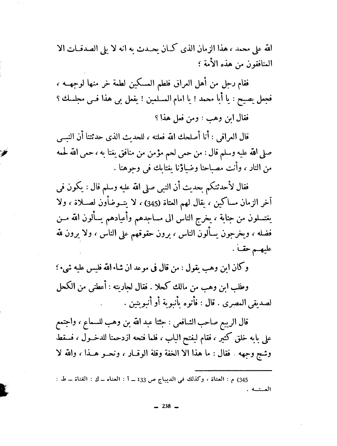 الله على محمد. هذا الزمان الذي كان يحدث به أنه لا يلي الصدقات إلا المنافقون من هذه الأمة. فقام رجل من أهل العراق فلطم المسكين لطمة خرج منها لوجهه. فجعل يصيح يا أبا محمد يا إمام المسلمين يفعل بي هذا في مجلسك. فقال ابن وهب: ومن فعل هذا؟ قال العراقي أنا أصلحك الله. فعلته للحديث الذي حدثتنا: أن النبي صلى الله عليه وسلم قال: من حمى لحم مؤمن من منافق يغتابه حمى الله لحمه من النار وأنت مصباحنا وضياؤنا. يغتابك في وجوهنا؟ فقال: لأحدثنكم بحديث. إن النبي صلى الله عليه وسلم قال في آخر الزمان يكون مساكين يقال لهم الغناة كذا لا يتوضأون لصلاة ولا يغتسلون من جنابة، يخرج الناس من مساجدهم وأعيادهم يسألون الله من فضله، ويخرجون يسألون الناس، يرون حقوقهم على الناس، ولا يرون حقوقهم عليهم حقاً.
