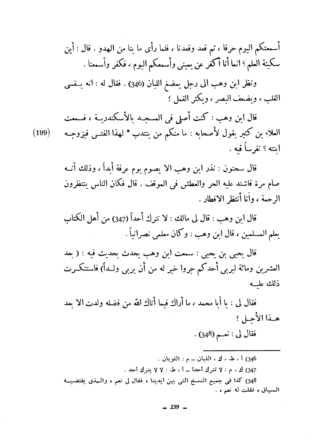 أسمعتكم اليوم حرفاً. ثم قعد وقعدنا. فلما رأى ما بنا من الهدوء، قال أين سكينة العلم، إنما أنا أكفِّر عن يميني وأسمعكم، فكفّر وأسمعنا. ونظر ابن وهب إلى رجل يمضغ اللبان فقال له: إنه يقسي القلب ويضعف البصر ويكثر القمل. قال ابن وهب: كنت أصلي في المسجد بالإسكندرية فسمعت العلا بن كثير يقول لأصحابه: ما منكم من يقترف هذا الفتى فيزوجه ابنته، تفرسنا فيه. قال سحنون: نذر ابن وهب أن لا يصوم يوم عرفة، أبداً. وذلك أنه صام مرة فاشتد عليه الحر والعطش في الموقف قال: فكان الناس ينتظرون الرحمة وأنا انتظر الإفطار. قال ابن وهب: قال لي مالك: لا تترك أحداً من أهل الكتاب يعلم المسلمين. قال ابن وهب: وكان معلمي نصرانياً. قال يحيى بن يحيى: سمعت ابن وهب يحدث بحديث فيه: بعد العشرين ومائة ليربّي أحدكم جرواً خيراً له من أن يربي ولداً. فاستنكرت ذلك عليه. فقال له: يا أبا محمد ما أراك فيما أتاك الله من فضله ولدت إلا بعد هذا الرجل. فقال لي: نعم.