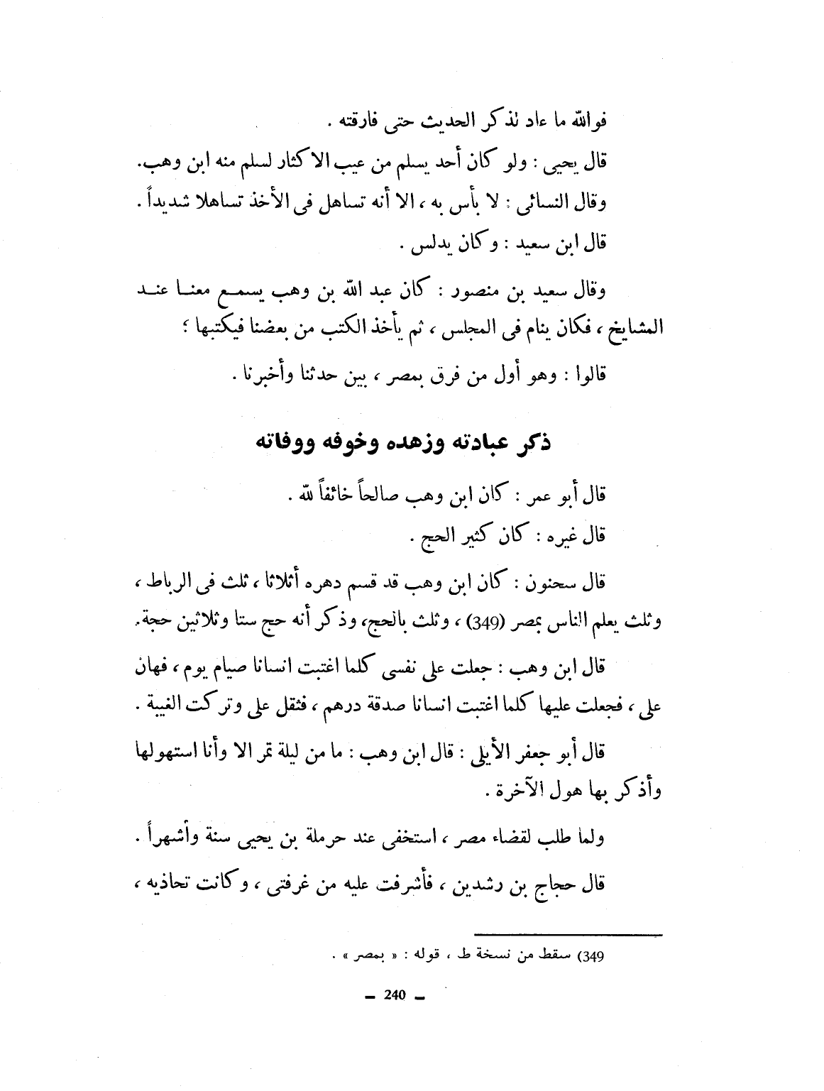 فوالله ما عاد إلى ذكر الحديث حتى فارقته. قال يحيى ولم كان أحد يسلم من عيب الإكثار لسلم منها ابن وهب. وقال النسائي: لا بأس به، إلا أنه تساهل في الأخذ تساهلاً شديداً. قال ابن سعيد: وكان يدلس. قال سعيد بن منصور: وكان عبد الله بن وهب يسمع معنا عند المشايخ؛ فكان ينام في المجالس ثم يأخذ الكتب من بعضنا فيكتبها. قالوا وهو أول من فرق بمصر بين نا وأنا.