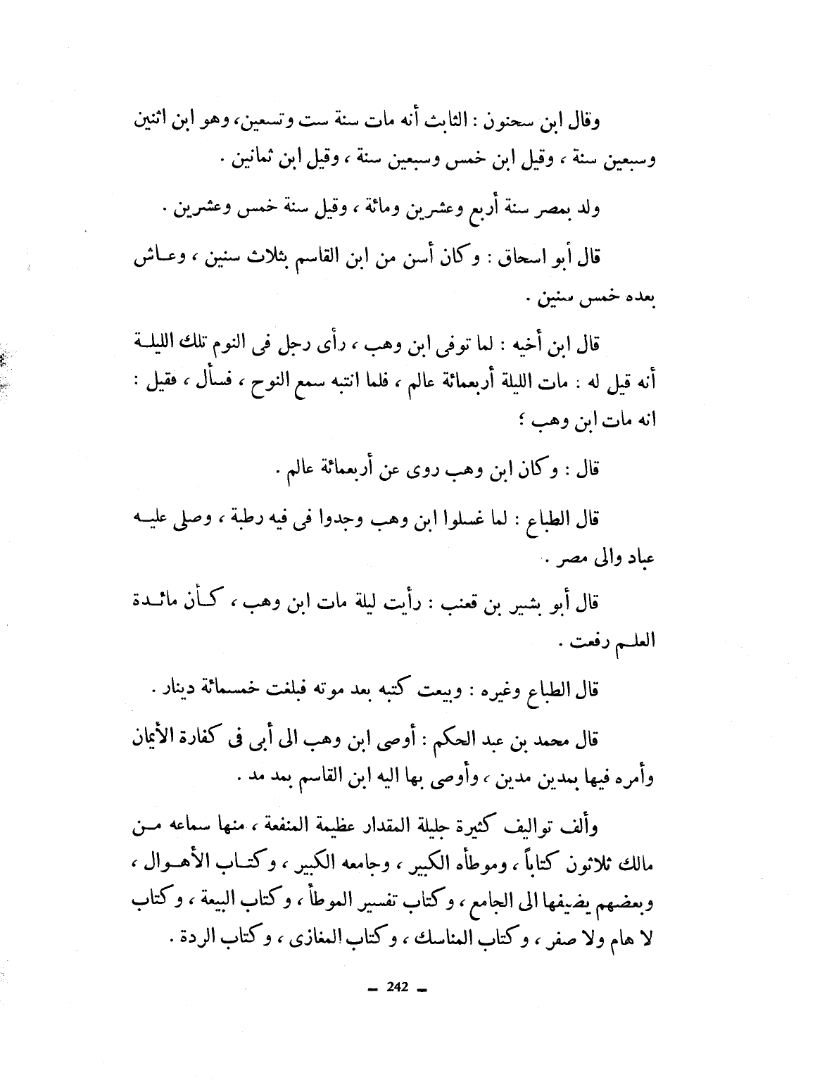 وقال ابن سحنون: الثابت أنه مات سنة ست وتسعين وهو ابن اثنتين وسبعين سنة. وقيل ابن خمس وسبعين سنة. وقيل ابن ثمانين. ولد بمصر سنة أربع وعشرين ومائة وقيل سنة خمس وعشرين قال أبو اسحاق: وكان أسنّ من ابن القاسم بثلاث سنين، وعاش بعده خمس سنين. قال ابن أخيه لما توفي ابن وهب رأى رجل في المنام تلك الليلة أنه قيل له مات الليلة أربعمائة عالم. فلما انتبه سمع النوح، فسأل فقيل له: مات ابن وهب قال وكان ابن وهب روى أربعمائة عالم قال الطباع فلما غسلوا ابن وهب وجدوا فيه رطبة وصلى عليه عبّاد والي مصر. قال أبو بشر بن قعنب رايت ليلة مايت ابن وهب كأن مائدة العلم رفعت. قال الطباع وغيره: وبيعت كتبه بعد موته، فبلغت خمسمائة دينار قال محمد بن عبد الحكمصى ابن وهب إلى أبي في كفّارة الأيمان، وأمره فيها بمّدين مدّين، وأوصى إليه بها ابن القاسم بمدّ بمدّ. وألف تآليف كثيرة جليلة المقدار عظيمة المنفعة منها سماعه على مالك، ثلاثون كتاباً. موطأه الكبير وجامعه الكبير وكتاب الأهوال وبعضهم يضيفها إلى الجامع، وكتاب تفسير الموطأ، وكتاب البيعة وكتاب لا هام ولا صفر. وكتاب المناسك. وكتاب المغازي. وكتاب الردة.