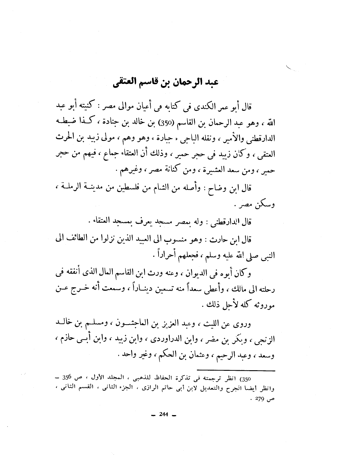 قال أبو عمر الكندي في كتابه موالي مصر: كنيته أبو عبد الله، وهو عبد الرحمان بن القاسم بن خالد ابن جنادة. كذا ضبطه الدارقطني والأمير، ونقله الباجي: جبارة وهو وهم، مولى زبيد بن الحارث العتقي. وكان زبيد في حجر حميد، وذلك أن العتقاء جماع فيهم من حجر حميد، ومن سعد العشيرة، ومن كنانة مصر وغيرهم. قال ابن وضاح: وأصله من الشام من فلسطين، من مدينة الرملة. وسكن مصر، قال الدارقطني: وله بمصر مسجد يعرف بمسجد العتقي. قال ابن الحارث: وهو منسوب إلى العبيد الذين نزلوا من الطائف إلى النبي صلى الله عيه وسلم، فجعلهم أحراراً. وكان أبوه في الديوان وعنه ورث ابن القاسم المال الذي أنفقه في رحلته إلى مالك، وأعطى سعداً منها خمسين ديناراً. وسمعت أنه خرج عن مورثه كله منه لأجل ذلك وروى عن الليث وعبد العزيز ابن الماجشون، ومسلم ابن خالد الزنجي، وبكر ابن مضر وابن الداروردي، وابن زبيد وابن أبي حازم وسعد وعبد الرحيم وعثمان ابن الحكم وغير واحد