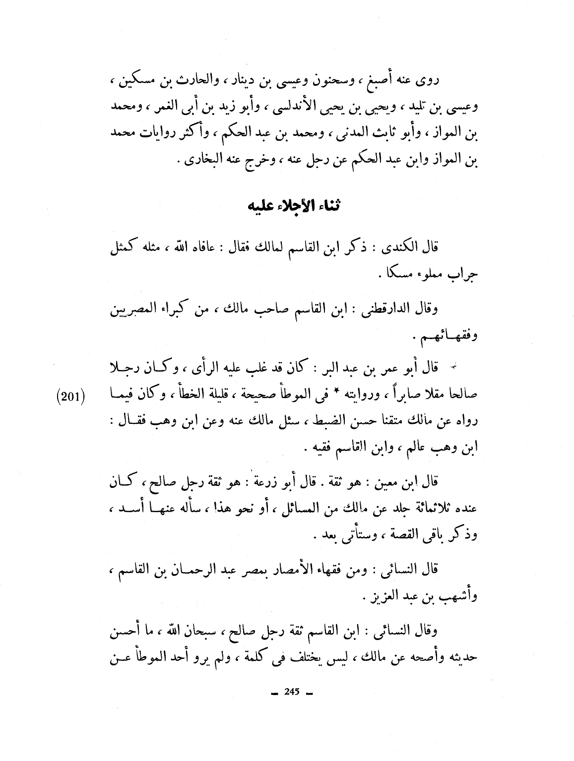 وقال النسائي: ابن القاسم ثقة رجل صالح، سبحان الله ما أحسن حديثه وأصحّه عن مالك، ليس يختلف في كلمة أحد ولم يرو أحد الموطأ عن