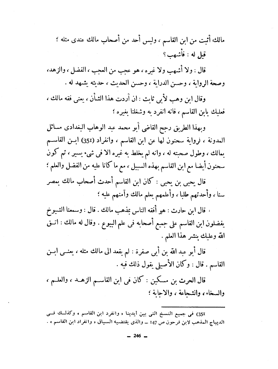 مالك أثبت من ابن القاسم، وليس أحد من أصحاب مالك عندي مثله. قيل له: فأشهب؟ قال: ولا أشهب ولا غيره، هو عجب من العجب، الفضل والزهد وصحة الرواية وحسن الدراية وحسن الحديث، حديثه يشهد له. وقال ابن وهب لأبي ثابت: إن أردت هذا الشأن، يعني فقه مالك، فعليك بابن القاسم، فإنه انفرد به وشغلنا بغيره. وبهذا الطريق رجح القاضي أبو محمد عبد الوهاب البغدادي مسائل المدونة لرواية سحنون لها عن ابن القاسم، وانفراد ابن القاسم بمالك وطول صحبته له، وأنه لم يخلط به غيره إلا في شيء يسير. ثم كون سحنون أيضاً مع ابن القاسم فهذه السبيل ما كان عليه من الفضل والعلم. قال يحيى بن يحيى: كان ابن القاسم أحدث أصحاب مالك بمصر منا، وأحدثهم طلباً وأعلمهم بعلم مالك وآمنهم عليه. قال ابن الحارث: هو أفقه الناس بمذهب مالك. قال: وسمعنا شيوخنا يفضلون ابن القاسم على جميع أصحابه في علم البيوع. وقال له مالك اتق الله وعليك بنشر هذا العلم. قال أبو عبد الله بن أبي صبرة: لم يقعد إلى مالك مثله. يعني ابن القاسم. قال وكان الأصيلي يقول ذلك فيه، وقال الحارث بن مسكين: كان في ابن القاسم الزهد والعلم والسخاء والشجاعة والإجابة.