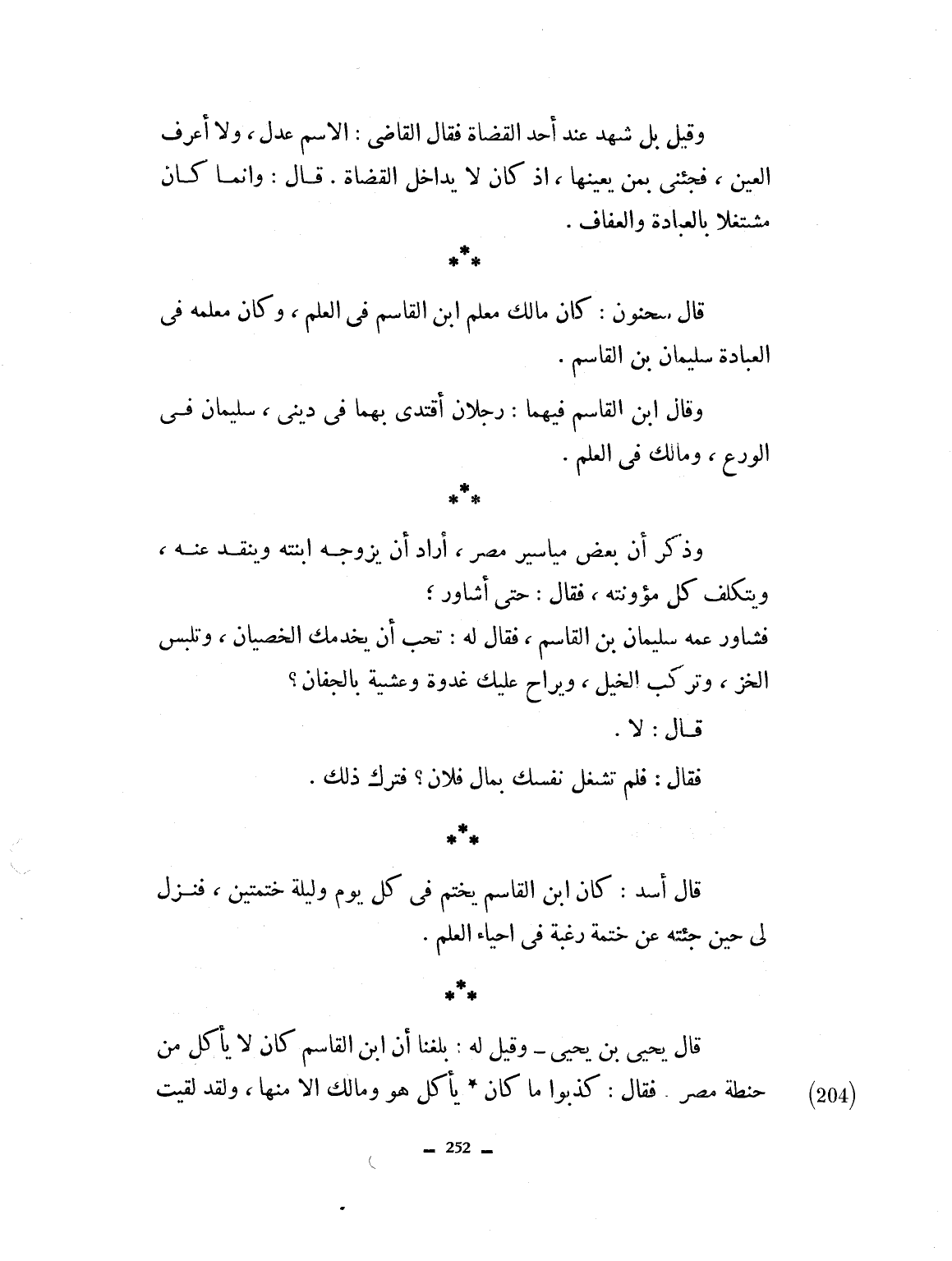 وقيل بل شهد عند بعض القضاة، فقال القاضي: الاسم عدل ولا أعرف العين. فجئني بمن يعنيها، إذ كان لا يداخل القضاة. قال: وإنما كان مشتغلاً بالعبادة والعفاف. قال سحنون: وكان مالك معلم ابن القاسم في العلم، وكان معلمه في العبادة سليمان بن القاسم. وقال ابن القاسم فيهما: رجلان أقتدي بهما في ديني، سليمان في الورع، ومالك في العلم. وذكر أن بعض سياسي مصر أراد أن يزوجه ابنته وينقد عنه ويتكلف مؤونته، فقال: حتى أشاور. فشاور عمه سليمان بن القاسم. فقال له: تحب أن يخدمك الخصيان وتلبس الخز وتركب الخيل ويراح عليك غدوة وعشية بالجفان؟ قال: لا. فقال له فلم تشغل نفسك بمال فلان! فترك ذلك. قال أسد: كان ابن القاسم يختم في كل يوم وليلة ختمتين فنزل لي حين جئته عن ختمة رغبة في إحياء العلم. وقال يحيى بن يحيى، وقيل له: بلغنا أنه ابن القاسم كان لا يأكل من حنطة مصر. فقال: كذبوا ما كان يأكل هو ومالك إلا منها. ولقيت