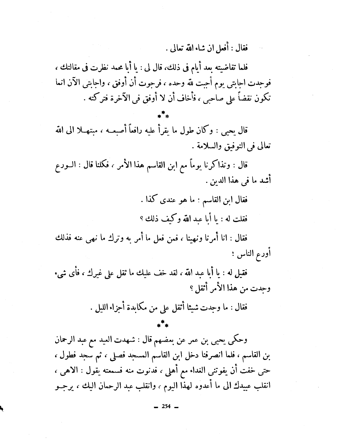 وحكى يحيى بن عمر عن بعضهم قال: شهدت العيد مع عبد الرحمن بن القاسم فلما انصرفنا دخل ابن القاسم المسجد فصلى، ثم سجد فطول حتى خفت أن يفوتني الغداء مع أهلي، فدنوت منه فسمعته يقول: إلهي انقلب عبادك إلى ما أعدوه لهذا اليوم وانقلب عبد الرحمان إليك يرجو