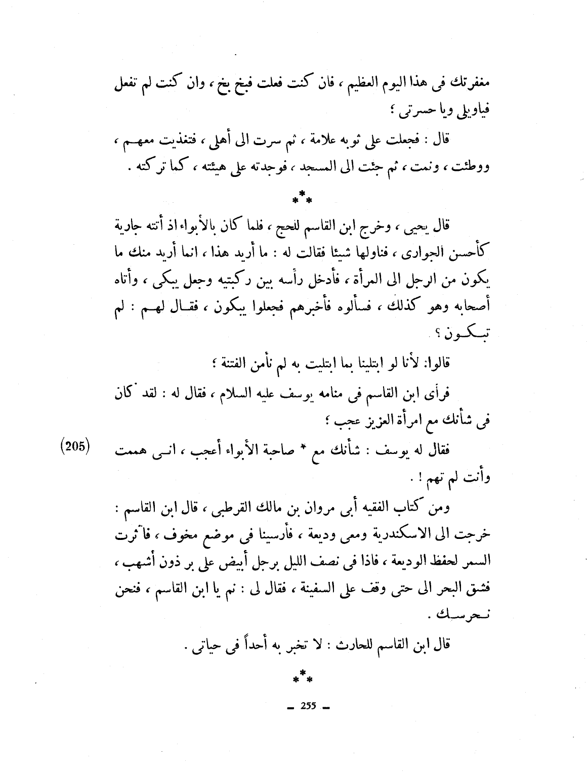 مغفرتك في هذا اليوم العظيم، فإن كنت فعلت فبخ بخ وإن كنت لم تفعل فيا ويلي ويا حسرتي، قال فجعلت على ثوبه علامة ثم سرت إلى أهلي، فتغديت معهم ووطئت وقمت ثم جئت المسجد فوجدته على هيأته كما تركته، قال يحيى: وخرج ابن القاسم إلى الحج، فلما كان بالأبواء، إذ أتته جارية كأحسن الجواري فناولها شيئاً، فقالت له ما أريد هذا، إنما أريد منك ما يكون من الرجل إلى المرأة، فأدخل رأسه بين ركبتيه وجعل يبكي، وأتاه أصحابه وهو كذلك فسألوه فأخبرهم، فجعلوا يبكون. فقال لهم لم تبكون؟ قالوا لأنا لو ابتلينا بما ابتليت به لم نأمن من الفتنة. فرأى ابن القاسم في المنام يوسف عليه السلام، فقال له: لقد كان في شأنك مع امرأة العزيز عجب فقال له يوسف شأنك مع صاحبة الأبواء أعجب إني هممت وأنت لم تهم، ومن كتاب الفقيه أبي مروان بن مالك القرطبي: قال ابن القاسم: خرجت إلى الإسكندرية ومعي وديعة فأرسينا في موضع مخوف فآثرت السهر لحفظ الوديعة، فإذ في شط البحر رجل أبيض على برذون أشهب فشق البحر إليّ حتى وقف على السفينة فقال لي: نم يا ابن القاسم فنحن نحرسها، قال ابن القاسم للحارث: لا نخبر به أحداً في حياتي.