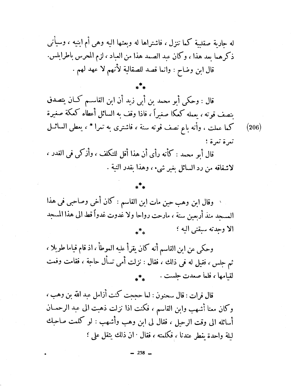 له جارية صقلبية كما تقول. فاشتراها له وبعثها له، وهي أم ابنيه. وسيأتي ذكرهما بعد هذا. وكان عبد الصمد هذا نم العباد، لزم المحرص باطرابلس، قال ابن وضاح وإنما قصد للصقالبة لأنهم لا عهد لهم، قال، وحكى أبو محمد بن أبي زيد ابن القاسم كان يتصدق بنصف قوته، يعمله كعكاً صغيراً فإذا وقف به السائل أعطاه كعكة صغيرة، كما عملت. وأنه باع نصف قوته سنة فاشترى به تمراً يعطي السائل تمرة. قال أبو محمد: كأنه رأى أن هذا أقل للمتكلف وأزكى في القدر لإشفاقه من رد السائل بغير شيء وهذا بقدر النية. وقال ابن وهب حين مات ابن القاسم: كان أخي وصاحبي في هذا المسجد منذ أربعين سنة. ما رحت رواحاً ولا غدوت غدواً قط إلى هذا المسجد إلا وجدته سبقني إليه. وحكى عن أبن القاسم أنه كان يقرأ عليه الموطأ إذ قام قياماً طولاً، ثم جلس. فقيل له في ذلك فقال: نزلت أمي تسأل حاجة، فقامت وقمت لقيامها، فلما صعدت جلست. قال: فسرَّت. قال سحنون: لما حججت كنت أزامل عبد الله بن وهب، وكان معنا أشهب وابن القاسم، فكنت إذا نزلت ذهبت إلى عبد الرحمان أسائله إلى وقت الرحيل، فقال لي ابن وهب وأشهب لو كلمت صاحبك ليلة واحدة يفطر عندنا. فكلمته. فقال إن ذلك يقل علي.