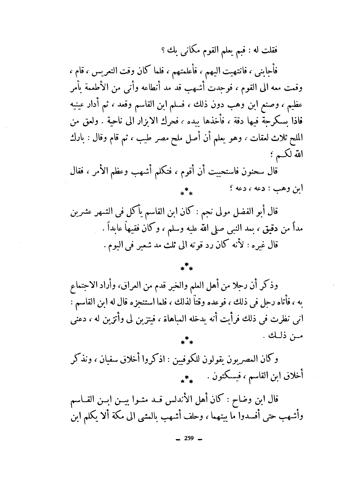 فقلت له فيم يعلم القوم مكاني بك. فأجابني. فانتهيت إليهم فأعلمتهم، فلما كان وقت التعريس قام وقمت معه إلى القوم، فوجدت أشهب قد مدّ أنطاعه وأتى من الأطعمة بأمر عظيم، وصنع ابن وهب دونك ذلك. فسلم ابن القاسم وقعد ثم أدار عينيه فإذا بسكرجة فيها دقة، فأخذها بيدها بيده فحرك الأبزاز إلى ناحية ولعق من الملح ثلاث لعقات، وهو يعلم أن اصل ملح مصر طيب. ثم قام وقال بارك الله لكم. قال سحنون: فاستحيت أن أقوم. فتكلم أشهب وعظم الأمر. فقال ابن وهب: دعه. قال أبو الفضل مولى نجم: كان ابن القاسم يأكل في الشهر عشرين مداً من دقيق بمد النبي صلى الله عليه وسلم، وكان فقيهاً عابداً. قال غيره: لأنه كان رد قوته إلى ثلث مد من شعير في اليوم. وذكر أن رجلاً من أهل العلم والخير قدم من العراق وأراد الاجتماع به فأتاه رجل في ذلك فوعده وقتاً لذلك، فلما استنجزه قال ابن القاسم: إني نظرت في ذلك فرأيت أنه يدخله المباهاة يتزين لي وأتزين له. دعني من ذلك وكان المصريون يقولون للكوفيين: اذكروا أخلاق سفيان، وتذكروا أخلاق ابن القاسم وأشهب حتى أفسدوا ما بينهما، وحلف أشهب بالمشي إلى مكة أن لا يكلم ابن