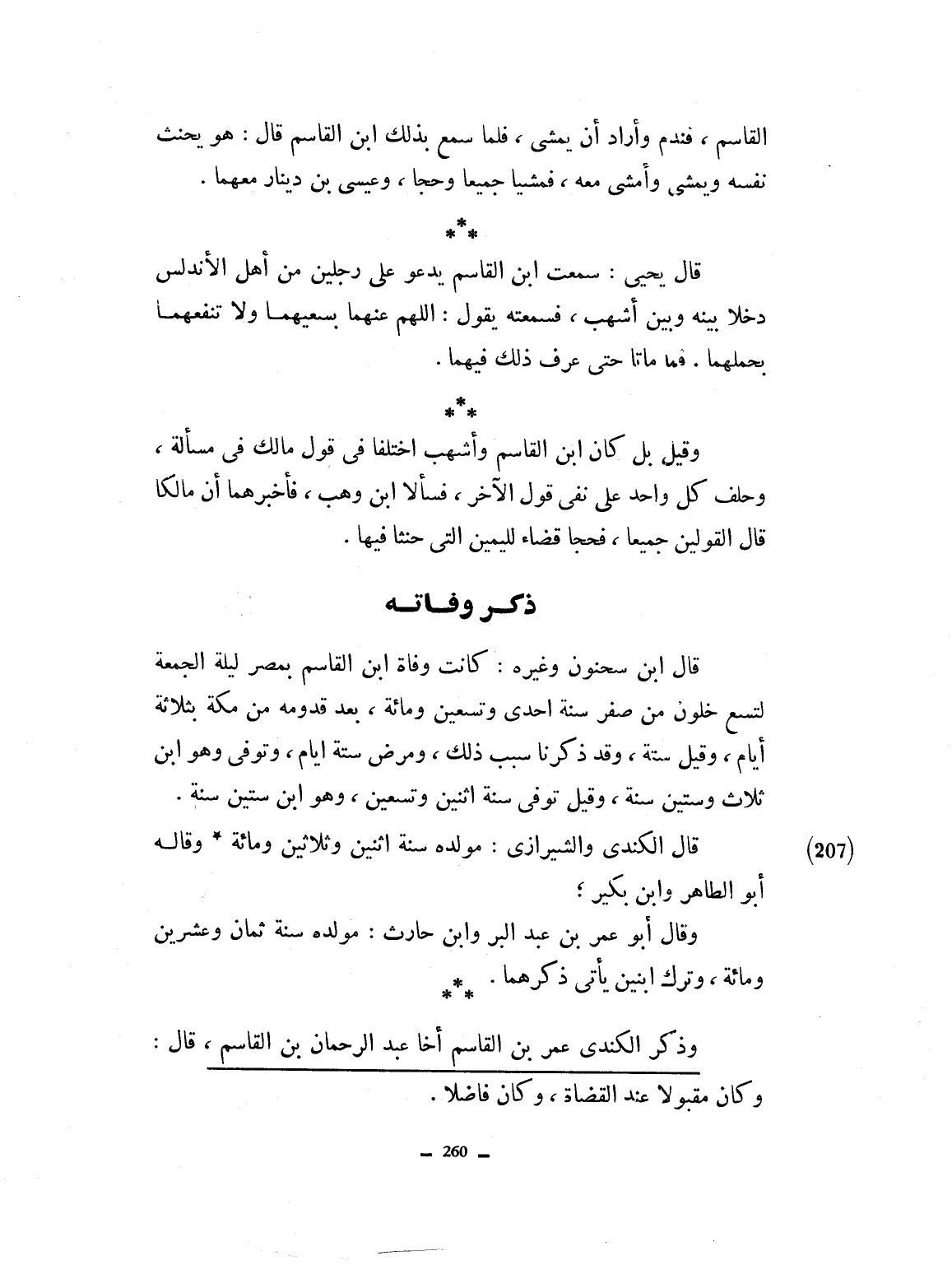 قال ابن سحنون وغيره: كانت وفاة ابن القاسم بمصر ليلة الجمعة لتسع خلون من صفر سنة إحدى وتسعين ومائة. بعد قدومه من مكة بثلاثة أيام. وقيل ستة. وقد ذكرنا سبب ذلك، ومرض ستة أيام وتوفي وهو ابن ثلاث وستين سنة. وقيل توفي سنة اثنتين وتسعين وهو ابن ستين سنة. قال الكندي والشيرازي: مولده سنة اثنتين وثلاثين ومائة وقال أبو الطاهر وابن بكير، وقال أبو عمر بن عبد البر وابن حارث مولده سنة ثمان وعشرين ومائة. وترك ابنين يأتي ذكرهما. وذكر الكندي عمر بن القاسم أخا عبد الرحمان بن القاسم. قال: كان مقبولاً عند القضاة. وكان فاضلاً.
