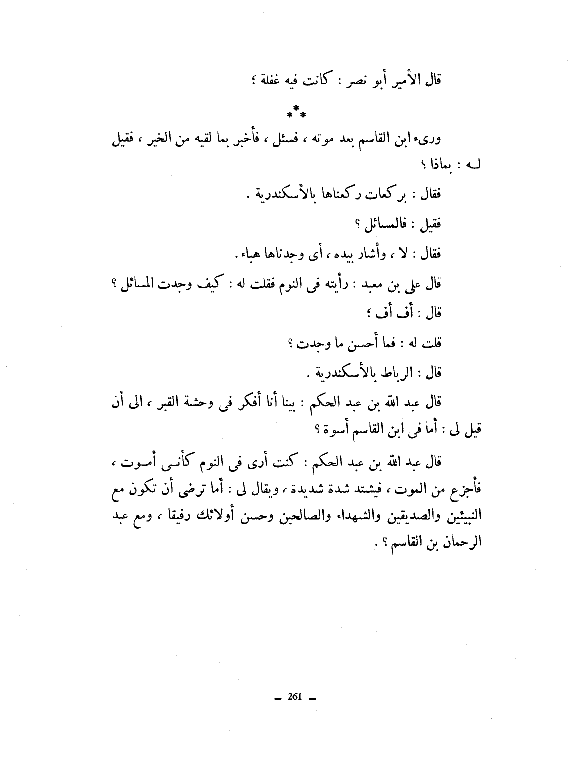 قال الأمير أبو نصر: كانت فيه غفلة. ورئي ابن القاسم بعد موته فسئل فأخبر بما لقيه من الخير، فقيل له بماذا قال بركعات ركعتها بالإسكندرية. فقيل بالمسائل. فقال لا وأشار بيده، أي وجدناها هباءً. قال علي ابن معبد: رأيته في النوم فقلت له: كيف وجدت المسائل قال أف أف. قلت له: فما أحسن ما وجدت قال الرباط بالإسكندرية. قال عبد الله بن عبد الحكم: بينا أنا أفكر في وحشة القبر إلى أن قيل لي أما في ابن القاسم أسوة. قال عبد بن الحكم: كنت أرى في النوم كأني أموت فاجزع من الموت فيشتد شدة شديدة ويقال لي: أنا ترضى أن تكون رفيقاً مع النبيين والصديقين والشهداء والصالحين وحسن أولئك رفيقاً. ومع عبد الرحمان ابن القاسم.