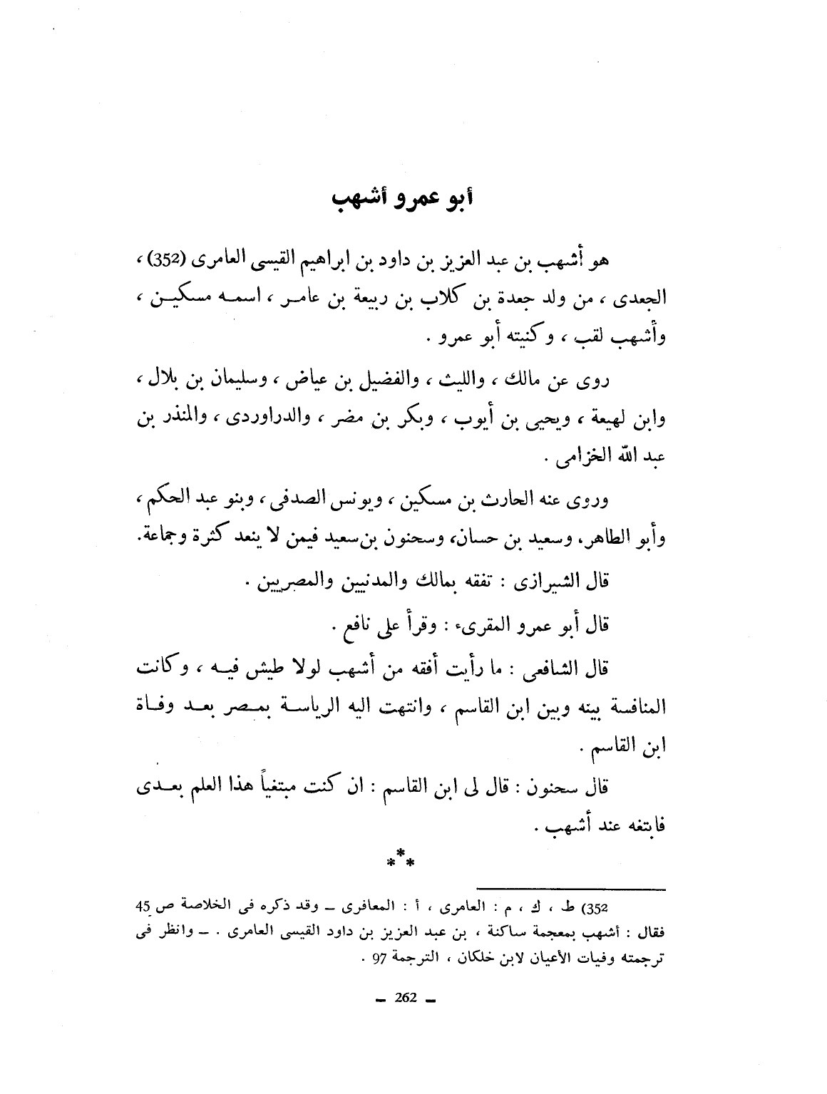 هو أشهب بن عبد العزيز بن داود بن إبراهيم القيسي المعافري الجعدي. من ولد جعدة بن كلاب بن ربيعة ابن عامر. اسمه مسكين. وأشهب لقب. وكنيته أبو عمرو زوى عن مالك والليث والفضيل بن عياض، وسليمان بن بلال وابن لهيعة، ويحيى بن أيوب وبكر بن مضر والدراوردي، والمنذر ابن عبد الله الحزامي. وروى عنه الحارث ابن مسكين ويونس الصدفي وبنو عبد الحكم، وأبو الطاهر وسعيد بن حسان وسحنون بن سعيد، فيما لا ينعد كثرة، وجماعة. قال الشيرازي: تفقه بمالك والمدنيين والمصريين. قال أبو عمر المقريء: وقرأ على نافع. قال الشافعي: ما رأيت أفقه من أشهب لولا طيش فيه. وكانت المنافسة بينه وبين ابن القاسم.