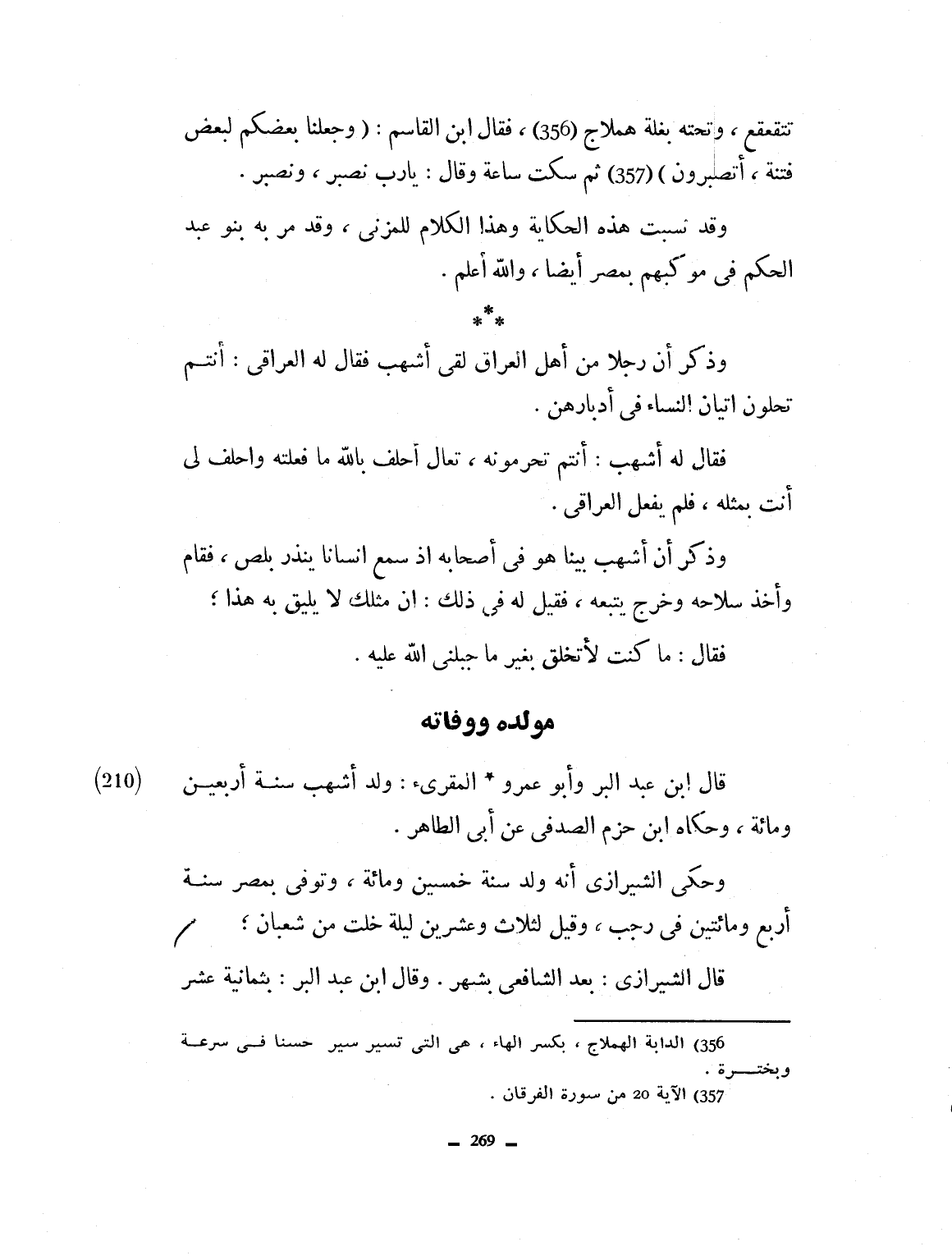 تتقعقع، وتحته بغلة هملاج، فقال ابن القاسم: وجعلنا بعضكم لبعض فتنة أتصبرون. ثم سكت ساعة وقال بلى: يا رب نصبر ونصبر. وقد نمت هذه الحكاية وهذا الكلام للمزني، وقد مرّ به بنو عبد الحكم في موكبهم بمصر أيضاً والله أعلم. وذكر أن رجلاً من أهل العراق لقي أشهب فقال له العراقي: أنتم تحلون إتيان النساء في أدبارهن، فقال أشهب: أنتم تحرمونه ولكن تعال أحلف لي ما فعلته، واحلف لي أنت بمثله، فلم يفعل العراقي.