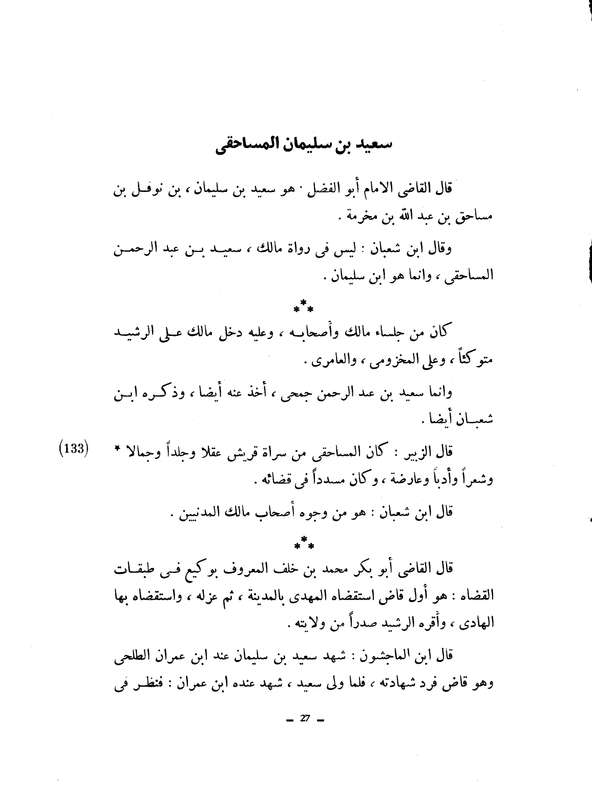 قال القاضي الإمام أبو الفضل: هو سعيد بن سليمان بن نوفل بن مساحق ابن عبد الله بن مخرمة. وقال ابن شعبان: ليس في رواة مالك سعيد بن عبد الرحمان المساحقي، وإنما هو ابن سليمان. كان من جلساء مالك وأصحابه، وعليه دخل مالك على الرشيد متوكئاً وعلى المخزومي والعامري. وإنما سعيد ابن عبد الرحمان جمحي أخذ عنه أيضاً، وذكره ابن شعبان أيضاً. قال الزبير: كان المساحقي من سراة قريش عقلاً وجلداً وجمالاً وشعراً وأدباً، وعارضة. وكان مسدداً في قضائه. قال ابن شعبان وهو من وجوه أصحاب مالك المدنيين. قال القاضي أبو بكر بن محمد بن خلف المعروف بوكيع في طبقات القضاة: هو أول قاض استقضاه المهدي بالمدينة وأقره الرشيد صدراً من ولايته. قال ابن الماجشون شهد سعيد بن سليمان عند ابن عمران الطلحي وهو قاض، فرد شهادته. فلما ولي سعيد شهد عنده ابن عمران فنظر في