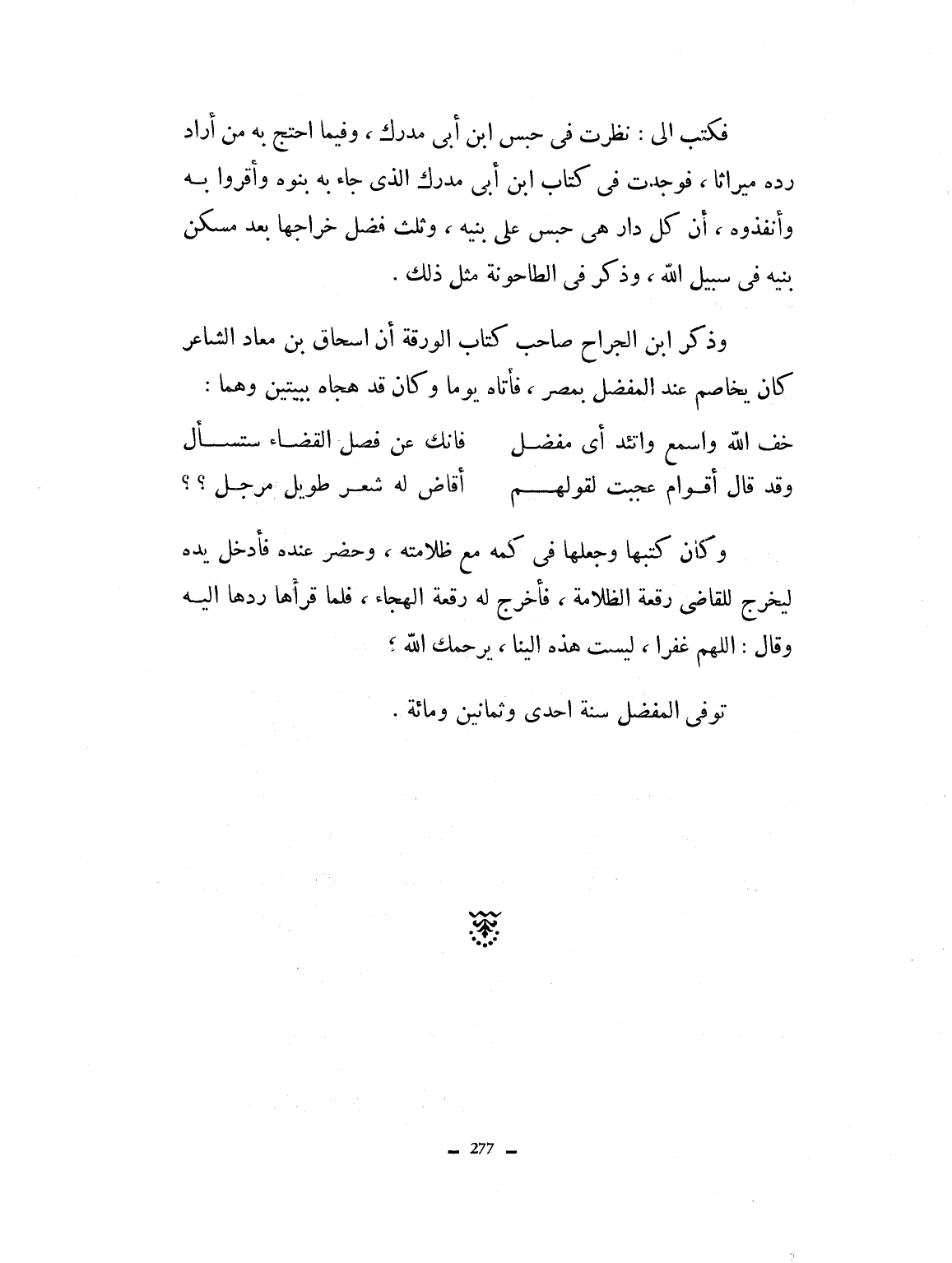فكتب إليّ: نظرت في حبس ابن أبي مدرك وفيما احتج به من أراد رده ميراثاً، فوجدت في كتاب ابن أبي مدرك الذي جاء به بنوه، وأقروا به وأنفذوه: إن كل دار هي له حبس على بنيه، وثلت فضل خراجها بعد سكن بنيه في سبيل الله. وذكر في الطاحونة مثل ذلك. وذكر ابن الجراح صاحب كتاب الورقة: أن اسحاق بن معاذ الشاعر كان يخاصم عند الفاضل بمصر، فأتاه يوماً وكان قد هجاه ببيتين وهما: