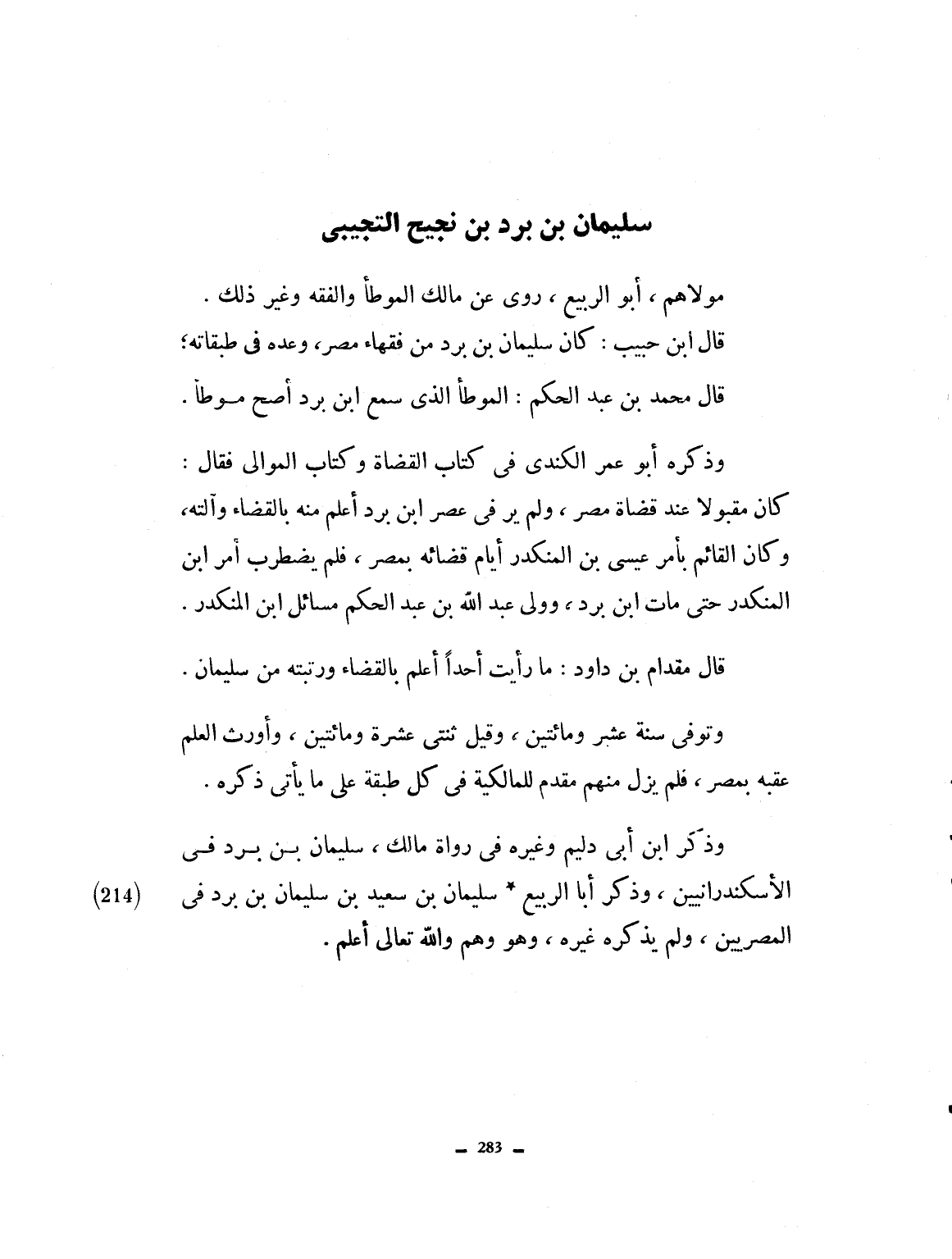 أبو الربيع. روى عن مالك الموطأ والفقه وغير ذلك. قال بن حبيب: كان سليمان بن برد من فقهاء مصر، وعده من طبقاته. قال محمد بن عبد الحكم: الموطأ الذي سمع ابن برد أصح موطأ. وذكره أبو عمر الكندي في كتاب القضاة، وكتاب الموالي، فقال: كان مقبولاً عند قضاة مصر. فقال: ولم ير في عصر ابن برد أعلم منه بالقضاء وآلته. وكان القائم بأمر عيسى ابن المنكدر أيام قضائه بمصر، لم يضطرب أمر ابن المنكدر حتى مات ابن برد، وولي عبد الله بن عبد الحكم مسائل ابن المكندر، وقال مقداد بن داود: ما رأيت أحداً أعلم بالقضاء ورتبته من سليمان، وتوفي سنة عشر ومائتين. وقيل اثنتي عشرة ومائتين وأورث العلم عقبه بمصر. فلم يزل منهم مقدم للمالكية في كل طبقة على ما يأتي ذكره. وذكر ابن أبي دليم وغيره من رواة مالك بن سليمان بن برد في الإسكندرانيين. وذكر أبا الربيع بن سليمان بن برد في المصريين ولم يذكر غيره وهو وهم والله أعلم.