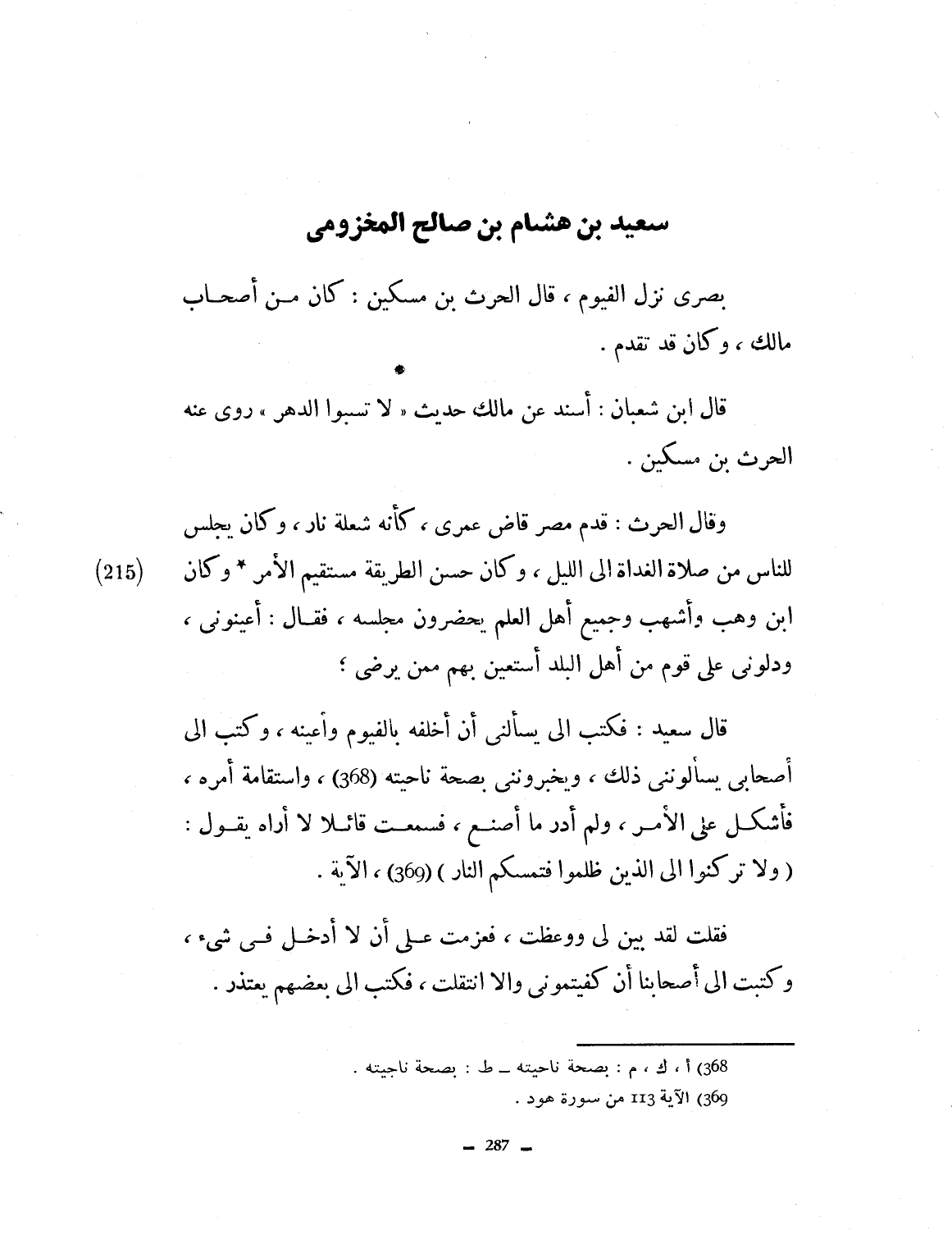 بصري نزل الفيوم. قال الحارث بن مسكين: كان من أصحاب مالك. وكان قد تقدم. قال ابن شعبان أسند عن مالك حديث: لا تسبوا الدهر. روى عنه الحارث بن مسكين، وقال الحارث: قدم مصر قاض عمري كأنه شعلة نار. وكان يجلس للناس من صلاة الغداة إلى الليل. وكان حسن الطريقة مستقيم الأمر، وكان ابن وهب وأشهب وجميع أهل العلم يحضرون مجلسه. فقال: أعينوني ودلوني على قوم من أهل البلد استعين بهم، فمن يرضى؟ قال سعيد: فكتب إليَّ أن أخلفه بالفيوم، وأعينه. وكتب إلي أصحابي يسألونني ذلك ويخبرونني بصحة واستقامة أمره، فأشكل علي الأمر ولم أدر ما اصنع. فسمعت قائلاً لا أراه ويقول: ولا تركنوا إلى الذين ظلموا فتمسّكم النّار.. الآية. فقلت لقد بيّن الله لي ووعظت، وعزمت على أن لا أدخل في شيء، وكتبت إلى أصحابنا أن كفيتموني وإلا انتقلت فكتب إلى بعضهم يعتذر.