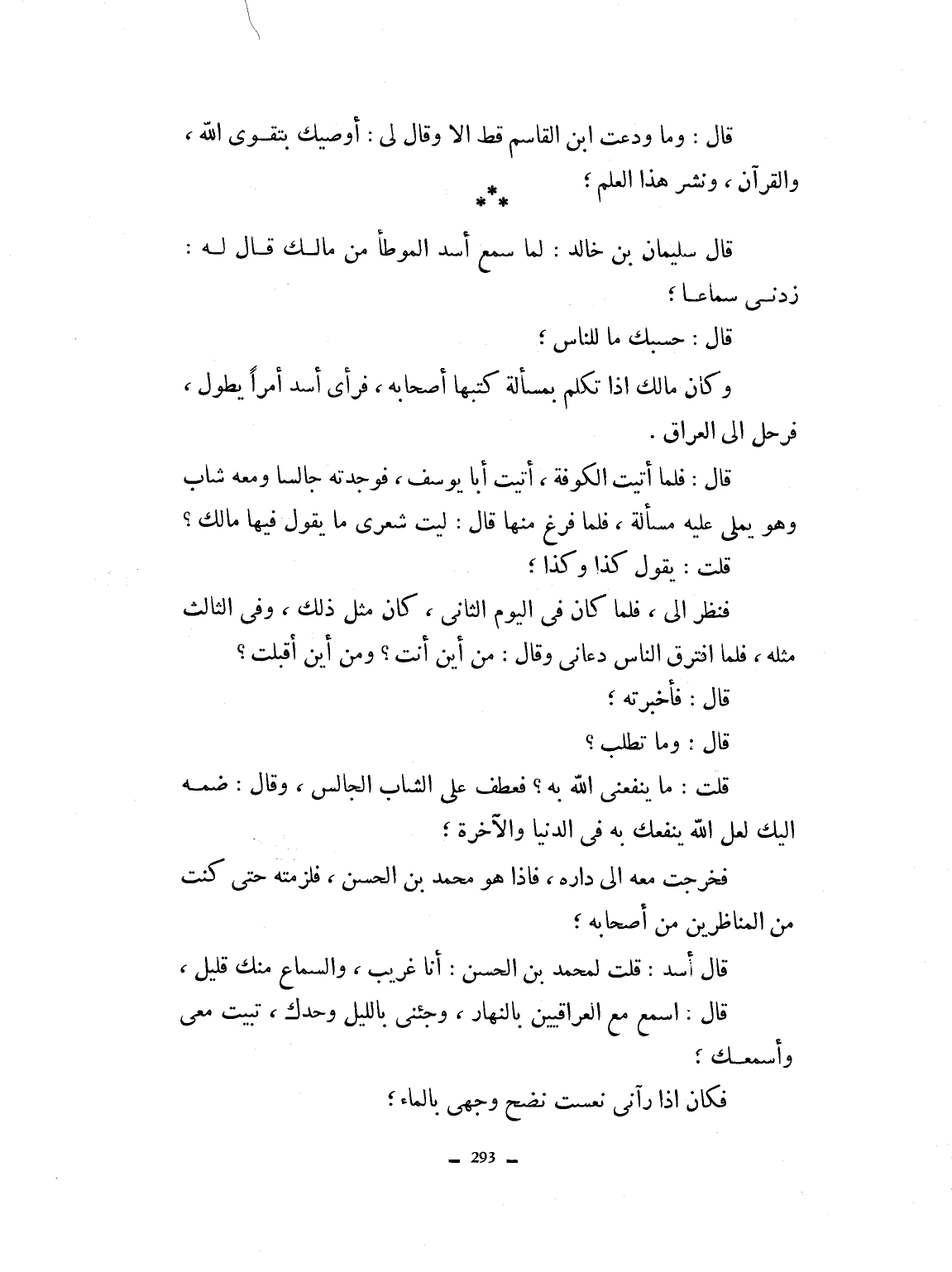 ونشر هذا العلم. قال سليمان بن خالد: لما سمع أسد الموطأ عن مالك قال له: زدني سماعاً. قال حسبك ما للناس. وكان مالك إذا تكلم بمسألة كتبها أصحابه فرأى أسد أمراً يطول فرحل إلى العراق، وقال: فلما أتيت الكوفة، أتيت أبا يوسف، فوجدته جالساً ومعه شاب وهو يملي عليه مسألة. فلما فرغ منها قال ليت شعري ما يقول فيها مالك؟ قلت كذا وكذا. فنظر إليّ، فلما كان في اليوم الثاني كان مثل ذلك، وفي الثالث مثله، فلما افترق الناس دعاني، وقال، من أين أنت ومن أين أقبلت؟ قال فأخبرته. قال وما تطلب؟ قلت ما ينفعني الله به، فعطف عليّ الشاب الجالس، فقال ضمه إليك، لعل الله ينفعك في الدنيا والآخرة فخرجت معه إلى داره، فإذا هو محمد بن الحسن. فلزمته حتى كنت من المناظرين من أصحابه. قال أسد: قلت لمحمد من الحسن أنا غريب والسماع منك قليل. قال اسمع العراقيين بالنهار وجئني بالليل وحدك تبيت معي، فأسمعك. فكان إذا رآني نعست نضج وجهي بالماء.