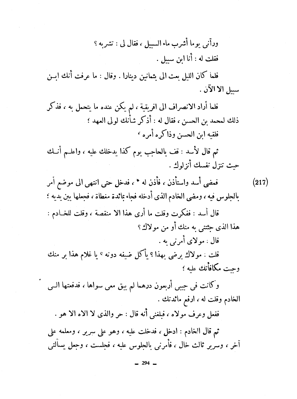 ورآني يوماً أشرب ماء السبيل فقال لي، تشربه؟ فقلت له أنا ابن سبيل. فلما كان الليل بعث إليّ بثمانين ديناراً. وقال ما عرفت أنك ابن سبيل، إلا الآن. فلما أراد الانصراف إلى إفريقية لم يكن عنده ما يتحمل به، فذكر ذلك لمحمد بن الحسن، فقال له، أذكر شأنك لولي العهد. فلقيه ابن الحسن وذاكره أمره ثم قال لأسد، قف بالحاجب يوم كذا يدخلك عليه، واعلم أنك حيث تنزل نفسك أنزلوك. فمضى أسد وأستأذن، فأذن له فدخل حتى أنتهى إلى موضع أمر بالجلوس فيه، ومضى الخادم الذي أدخله، فجاء بمائدة مغطاة فجعلها بين يديه قال أسد ففكرت وقلت ما أرى هذا إلا منقصة. وقلت للخادم، هذا الذي جئتني به منك أو من مولاك. قال مولاي أمرني به. قلت: مولاك لا يرضى بهذا يأكل ضيفه دونه. يا غلام هذا برّ منك وجبت مكافأتك عليه. وكانت في جيبي أربعون درهماً لم يبق معي سواها فدفعتها إلى الخادم، وقلت له أرفع مائدتك. ففعل وعرّف مولاه. فبلغني أنه قال حر والذي لا إله إلا هو. ثم قال الخادم ادخل. فدخلت عليه. وهو على سرير ومعلمه على آخر، وسرير ثالث. قال فأمرني بالجلوس عليه، فجلست. وجعل يسائلني