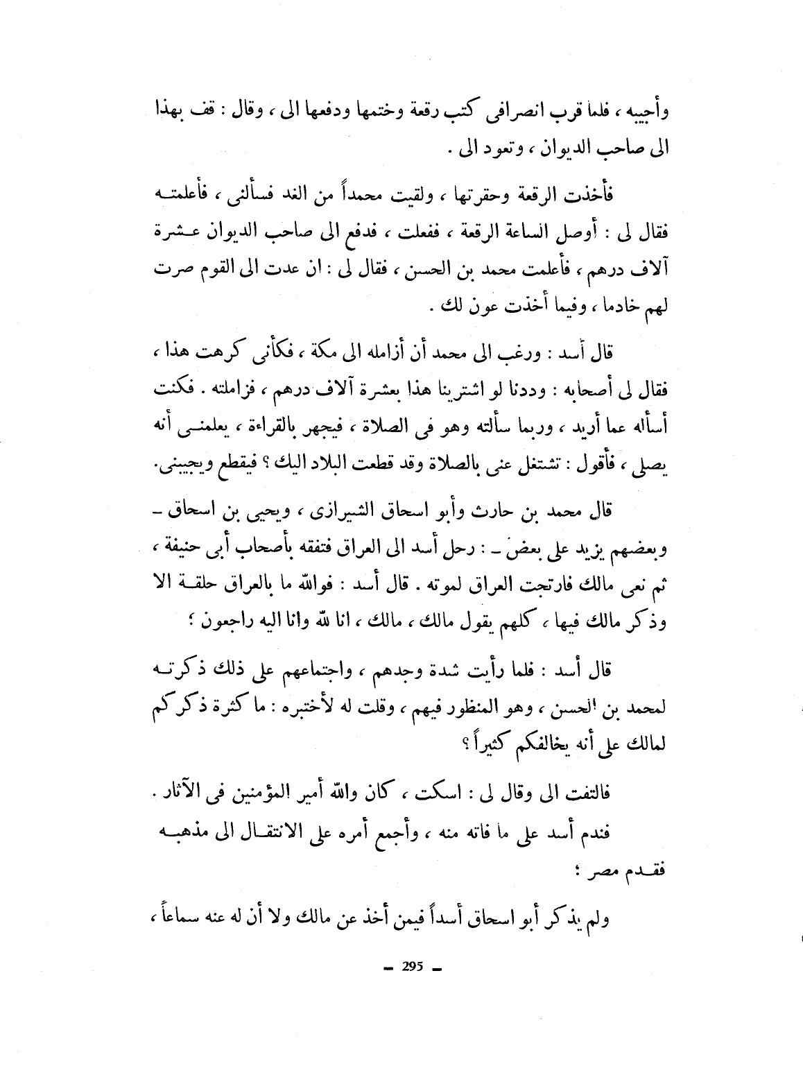 وأجيبه، فلما قرب انصرافي كتب رقعة وختمها ودفعها إليّ وقال قف بهذا إلى صاحب الديوان وتعود إليّ. فأخذت الرقعة وحضرتها. ولقيت محمداً من الغد فسألني، فأعلمته. فقال لي أوصل الساعة الرقعة. ففعلت. فدفع إليّ صاحب الديوان عشرة آلاف درهم، فأعلمت محمد بن الحسن فقال لي إن عدت إلى القوم صرت لهم خادماً، وفيم أخذت عون لك. قال أسد، ورغب إليّ محمد أن أزامله إلى مكة. فكأني كرهت هذا. فقال لي أصحابه وددنا لو اشترينا هذا منه بعشرة آلاف درهم، فزاملته. فكنت أسأله عما أريد، وربما سألته وهو في الصلاة، فيمهد بالقراءة يعلمني أنه يصلي، فأقول: تشغل عني الصلاة وقد قطعت البلاد إليك. فيقطع ويجيبني. قال محمد بن الحارث وأبو اسحاق الشيرازي ويحيى بن اسحاق وبعضهم يزيد على بعض، رحل أسد إلى العراق فتفقه بأصحاب أبي حنيفة. ثم نعي مالك فارتجت العراق لموته. قال أسد فوالله ما بالعراق حلقة إلا وذكر مالك فيها. كلهم يوقل مالك، واجتماعهم على ذلك ذكرته لمحمد بن الحسن، وهو المنظور فيهم. وقلت له لأختبره ما كثرة ذكركم لمالك، على أنه يخالفكم كثيراً. فالتفت إليّ وقال لي اسكت. كان والله أمير المؤمنين في الآثار. فندم أسد على ما فاته وجمع أمره على الانتقال إلى مذهبه. فقدم مصر
