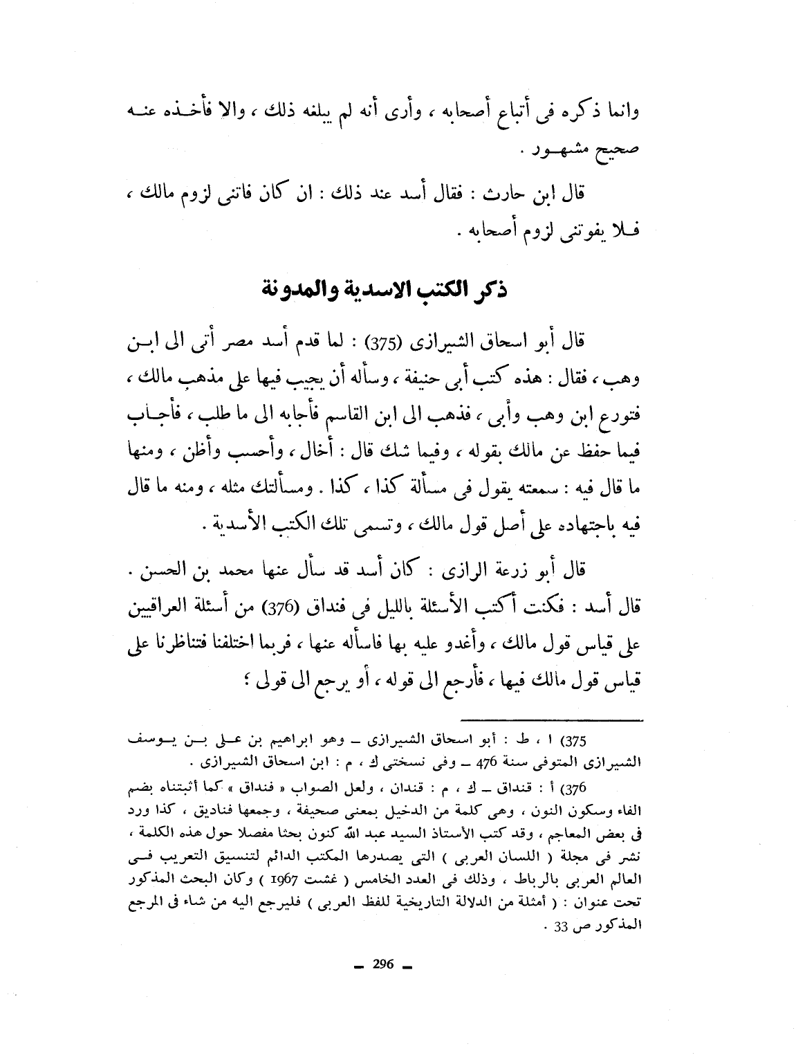 وإنما ذكره في اتباع أصحابه. وأرى أنه لم يبلغه ذلك وإلا فأخذه عنه صحيح مشهور. قال ابن الحارث: فقال أسد عن ذلك: إن كان فاتني لزوم مالك فلا يفوتني لزوم أصحابه. والله تعالى أعلم. م يذكر أبو اسحاق أسداً فيمن أخذ عن مالك ولا أن له عنه سماعاً، وإنما ذكره في اتباع أصحابه. وأرى أنه لم يبلغه ذلك وإلا فأخذه عنه صحيح مشهور. قال ابن الحارث: فقال أسد عن ذلك: إن كان فاتني لزوم مالك فلا يفوتني لزوم أصحابه. والله تعالى أعلم.