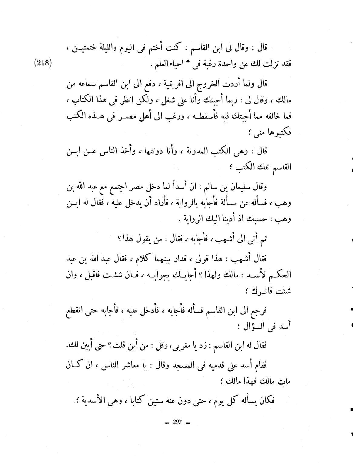 قال: وقال لي ابن القاسم: كنت اختم في اليوم والليلة ختمين فقد نزلت لك عن واحدة رغبة في إحياء العلم. قال: ولما أردت الخروج إلى إفريقية دفع إليّ ابن القاسم سماعه من مالك. وقال لي ربما أجبتك وأنا على شغل. ولكن أنظر في هذا الكتاب فما خالفه مما أجبتك فيه، فأسقطه. ورغب إلي أهل مصر في هذه الكتب فكتبوها مني. قال وهي الكتب المدونة وأنا دونتها. وأخذ الناس عن ابن القاسم تلك الكتب. وقال سليمان بن سالم: إن أسداً لما دخل مصر اجتمع مع عبد الله بن وهب، فسأله عن مسألة فأجابه بالرواية. فأراد أن يدخل عليه، فقال له ابن وهب: حسبك إذ أدّينا إليك الرواية. ثم أتى إلى أشهب فأجابه. فقال له من يقول هذا: قال أشهب. هذا قولي. فدار بيننا كلام فقال عبد الله بن عبد الحكم الأسد: كذا مالك. ولهذا أجابك بجوابه. فإن شئت فأقبل وإن شئت فأترك. فرجع إلى ابن القاسم فسأله، فأجابه. فأدخل عليه، فأجابه حتى انقطع أسد في السؤال. فقال له ابن القاسم كذا. ازياد مغربي. وقال له من أين أقبلت؟ حتى أتبين لك. فقام أسد في المسجد على قدميه، وقال: معاشر الناس، إن كان مات مالك، فهذا مالك. فكان يسأله كل يوم، حتى دون عنه ستين كتاباً، وهي الأسدية.